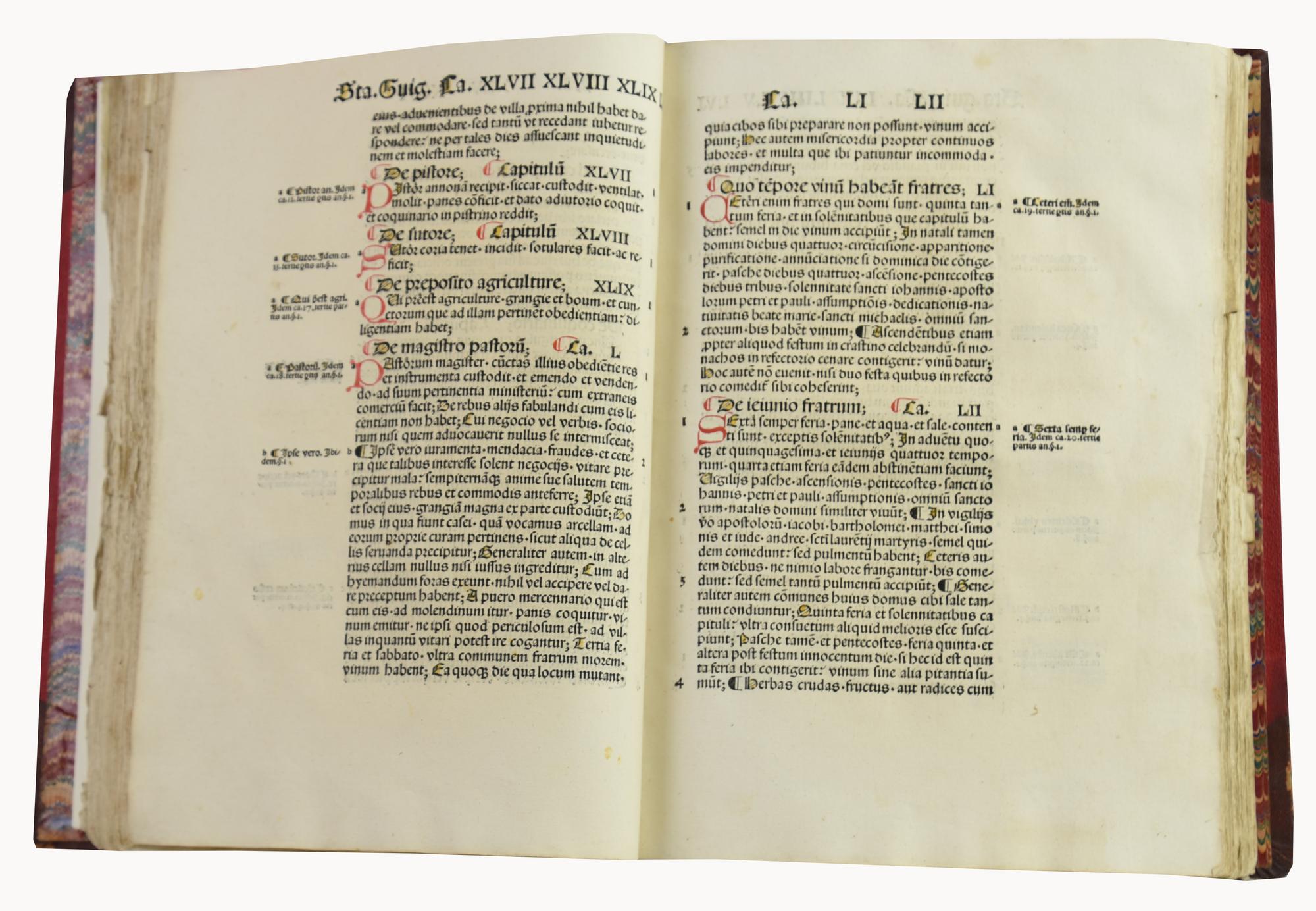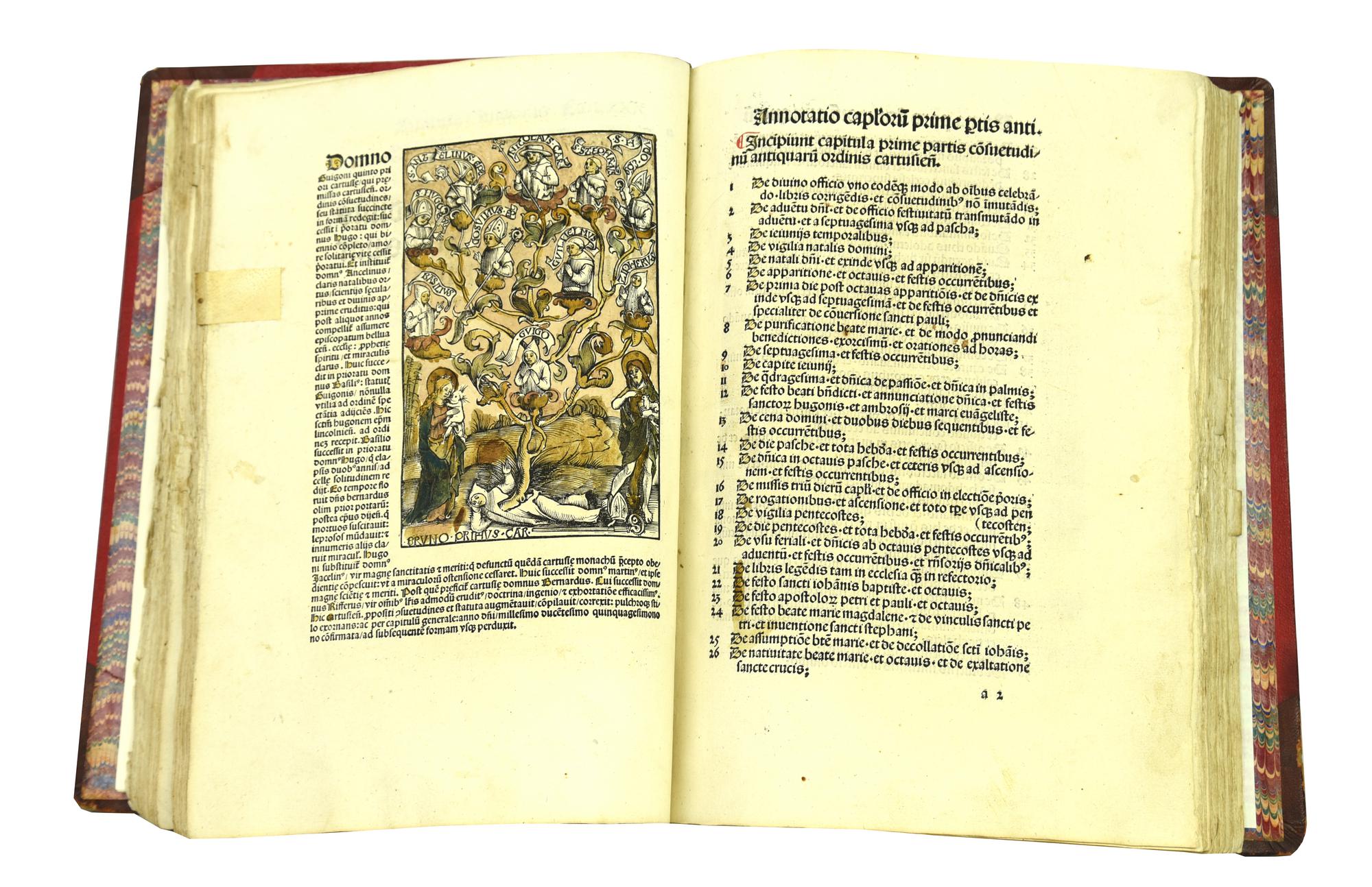 La parte testo è preceduta nella legatura originale dal "Repertoriu(m)in statuta ordinis cartusiensis per litteras alphabeti" in cui i primi 31 fogli mancanti sono sostituiti da fotocopie, seguono i successivi fogli originali. Interni in ottime condizioni.