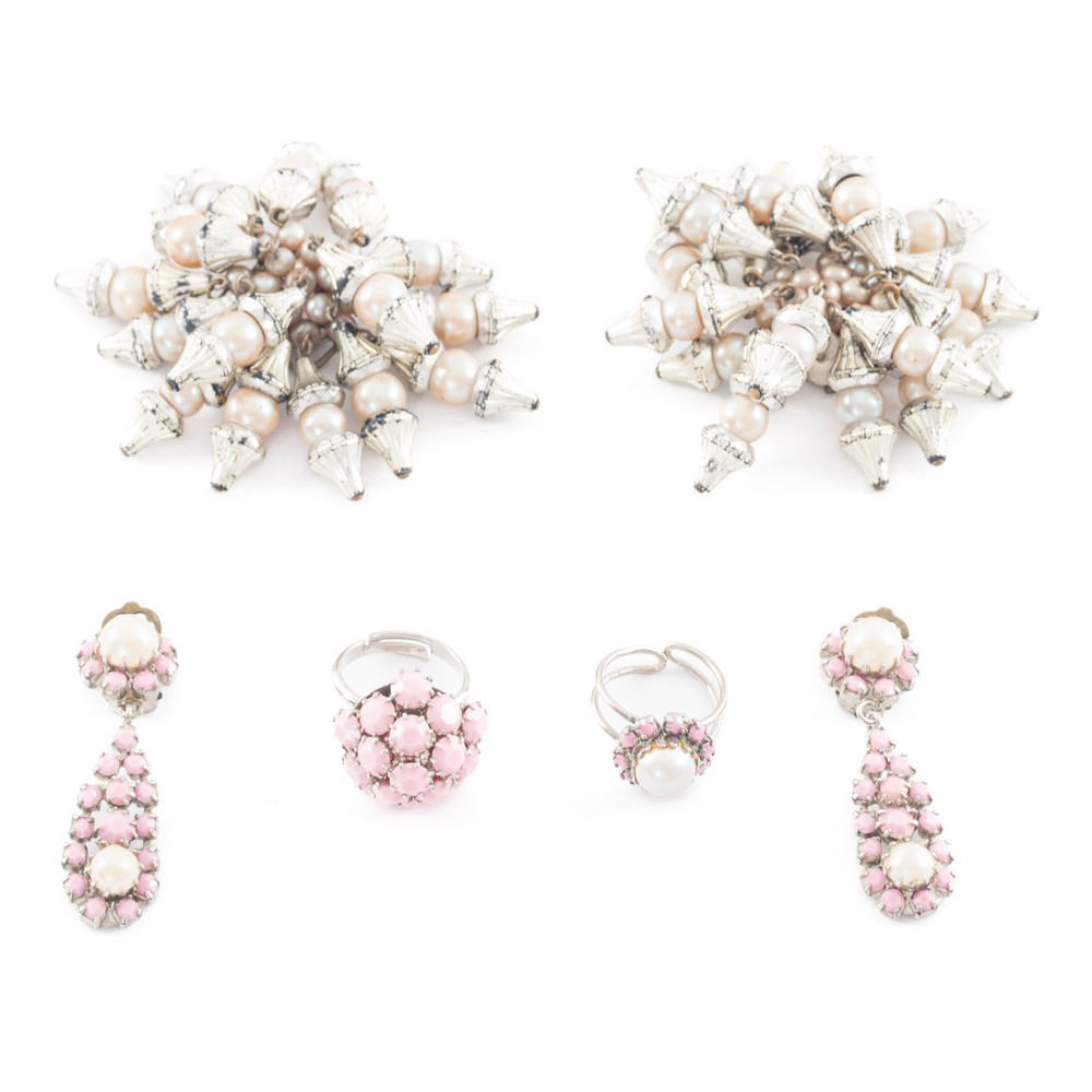 1) Parure composta da un paio di orecchini vintage pendenti e due anelli con pietre rosa confetto e perline.