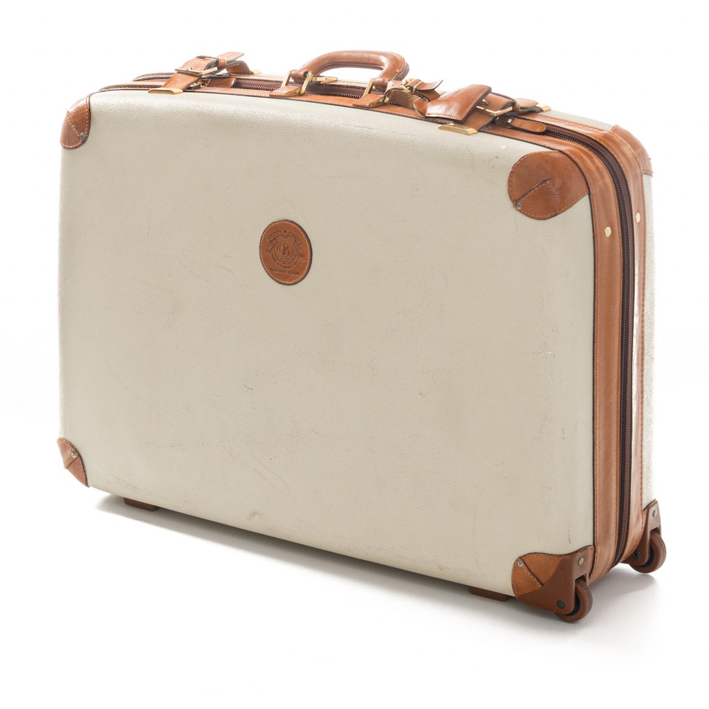 Valigia rigida con ruote, manifattura Fiorentina Bojola, con rifiniture in cuoio, segni del tempo.