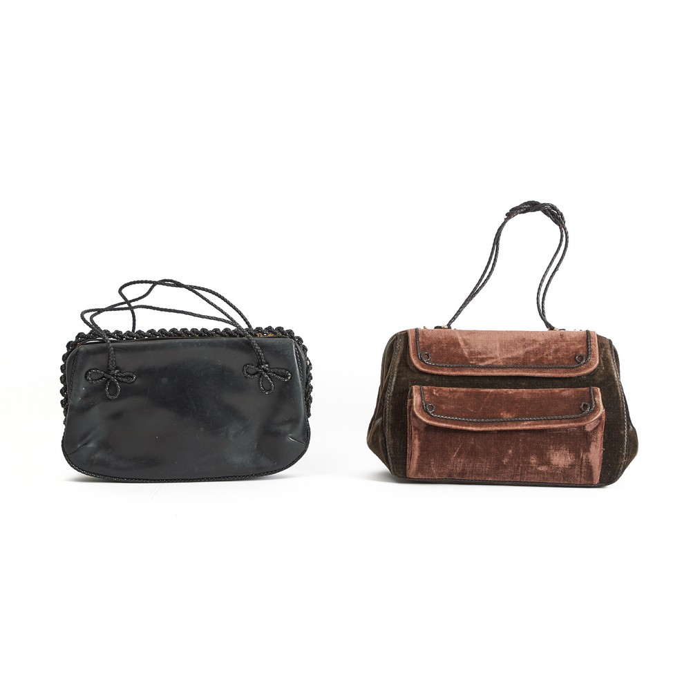 1) Borsa Roberta di Camerino degli anni 50 in velluto marrone con manici e rifiniture in pelle intrecciata nera. Presenta segni di usura.