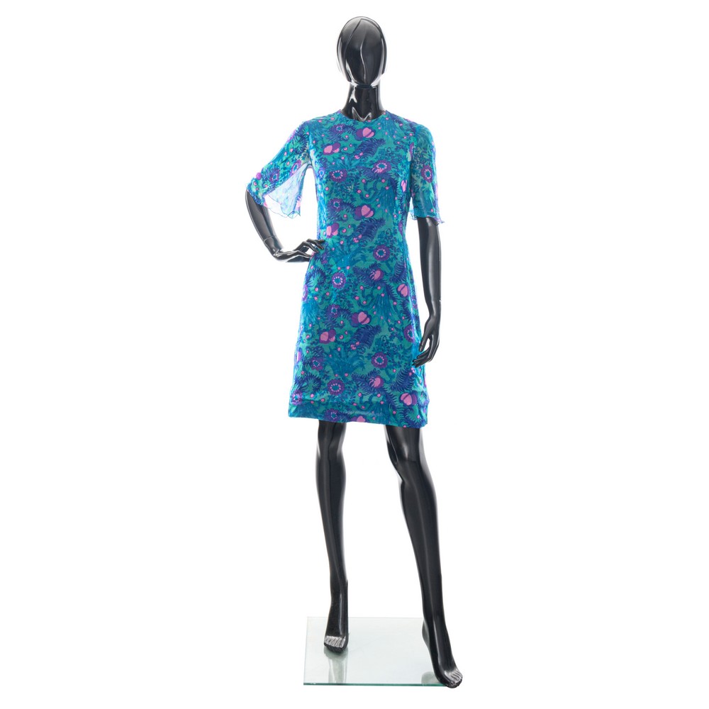 3) Abito in pura seta vintage sartoriale a motivo floreale, piccolo buco sul busto, TG. S.