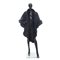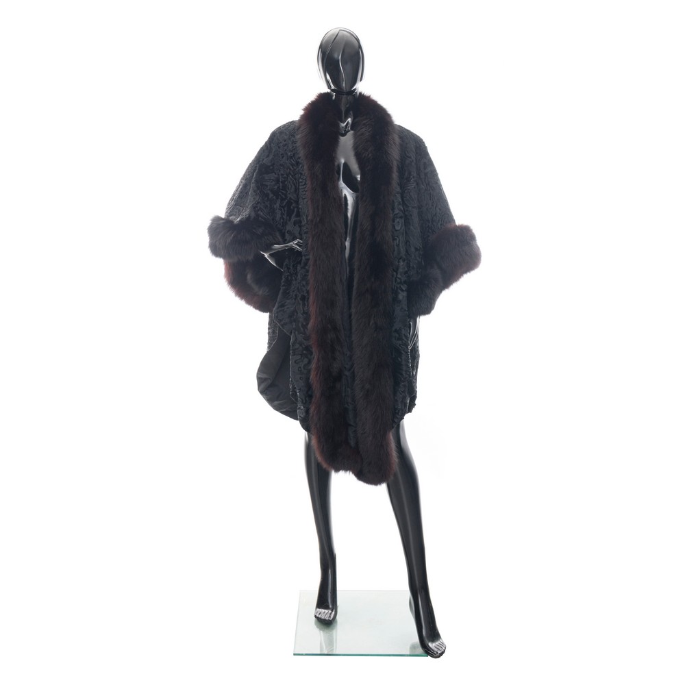 Ampia mantella in astrakan nero bordata in pelliccia di volpe.