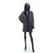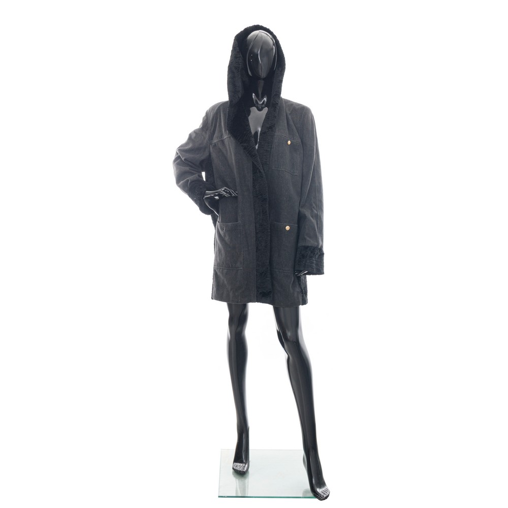 Giaccone Grati in jeans nero e pelliccia ecologica con cappuccio.
