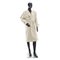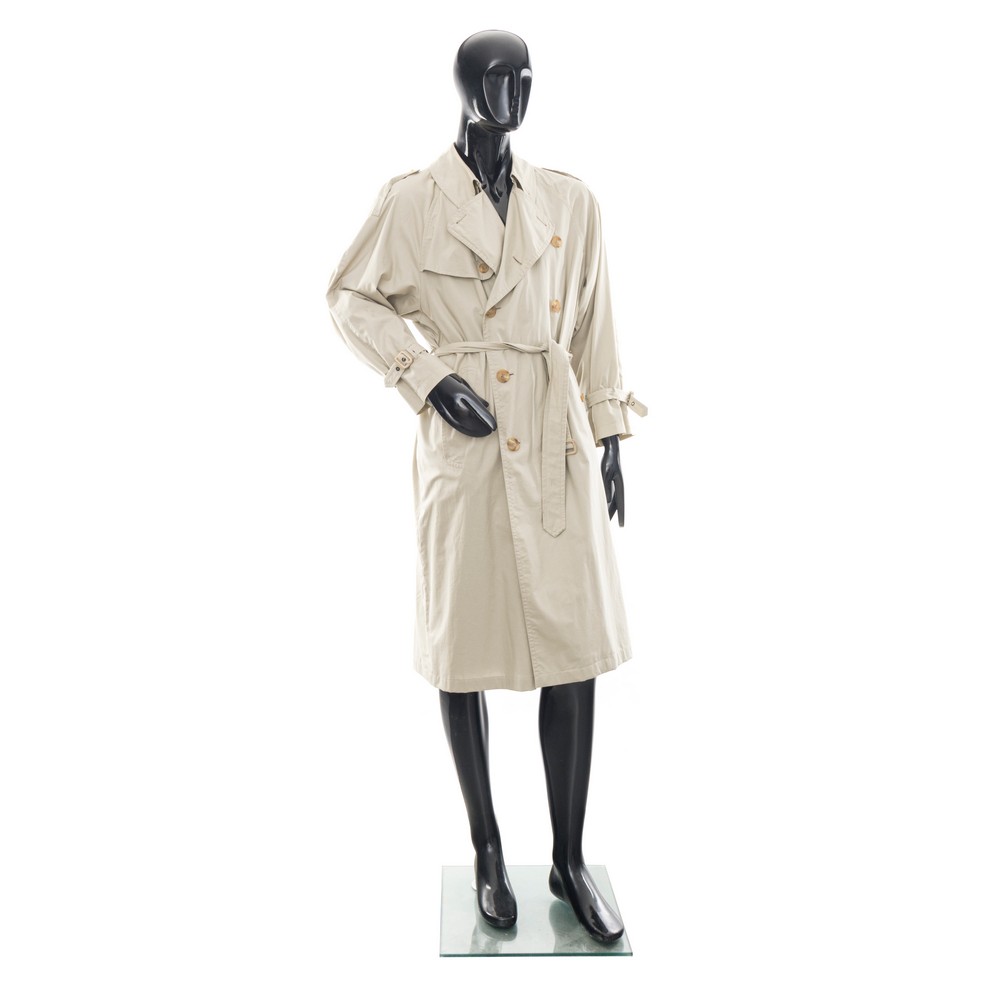 Impermeabile in twill beige con maniche a raglan, cintura con fibbia, due tasche.