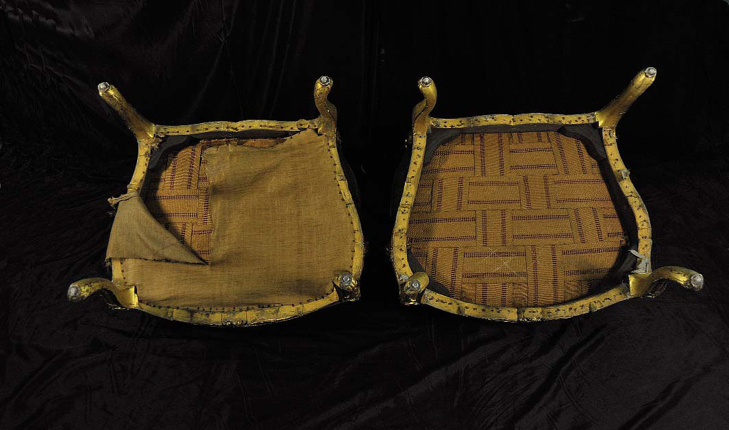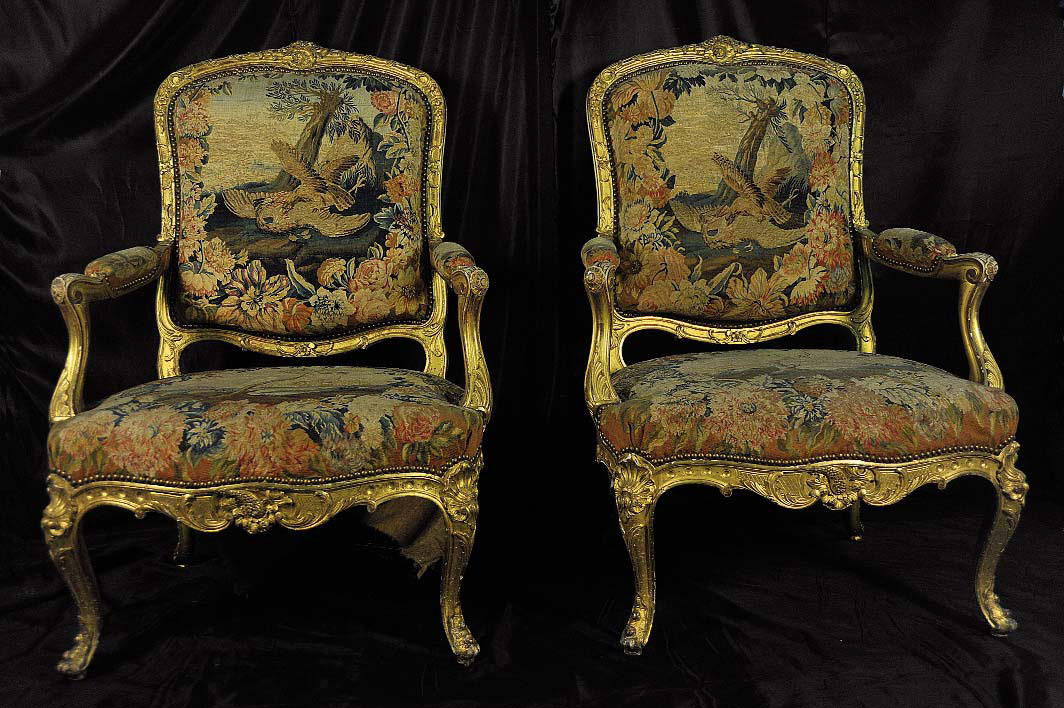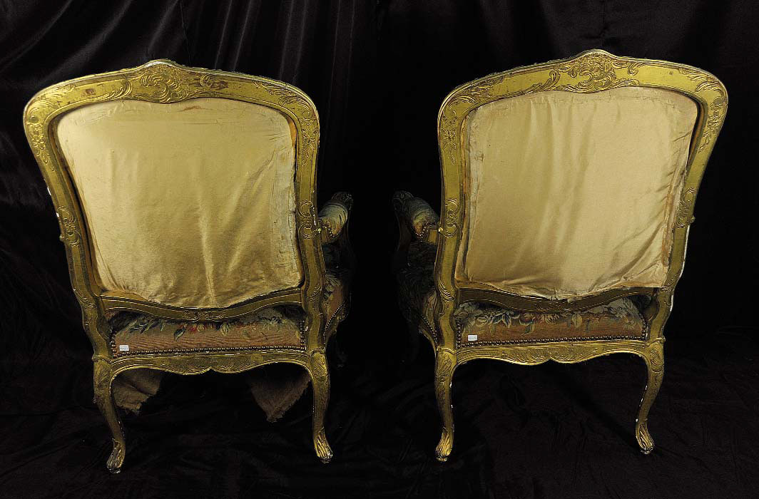 COPPIA DI POLTRONE IN STILE LUIGI XV CON TAPPEZZERIA SCENICA AUBOUSSON Produzione francese, 1755-1775 ca. Legno di noce dorato, tappezzeria di Aubousson Ognuna 107x73x70 cm. Stato di conservazione Superficie: 60% (tappezzeria consunta) Struttura: 80% (danni al telaio della seduta)