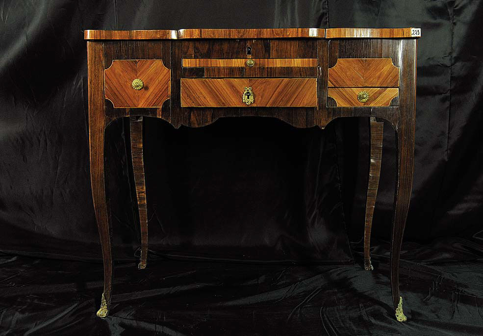 TOLETTA IN STILE LUIGI XV INTARSIATO CON TEMI DI PAESAGGIO Produzione francese, XIX secolo Noce e tulipier (?), impiallicciatura e intarsio, bronzo dorato 70,5x78,6x47 cm. Intarsio nel gusto di Léonard Boudin (1735-1807) e André Louis Gilbert (17461809): cfr. lo scrigno da documenti qui a fianco, databile al 1775, ora presso Kollenburg, Oirschot (Olanda) Un cassetto finto Stato di conservazione Superficie: 90% Struttura: 60% (imbarcatura) Note: Il cassetto frontale non si chiude Pannelli del pianale bloccati Chiavi presenti Presenza vetro non riscontrata Strumenti da toletta assenti