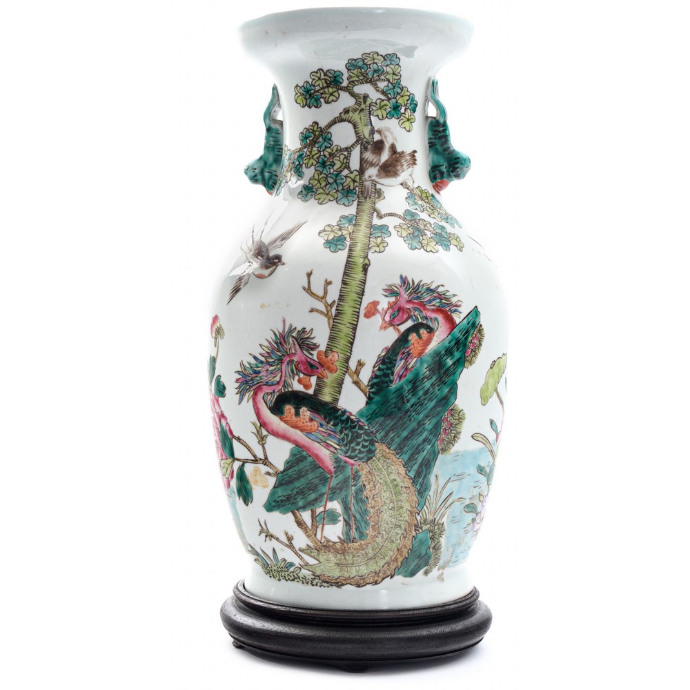 VASO in porcellana dipinta con base in legno. Cina XX secolo.
