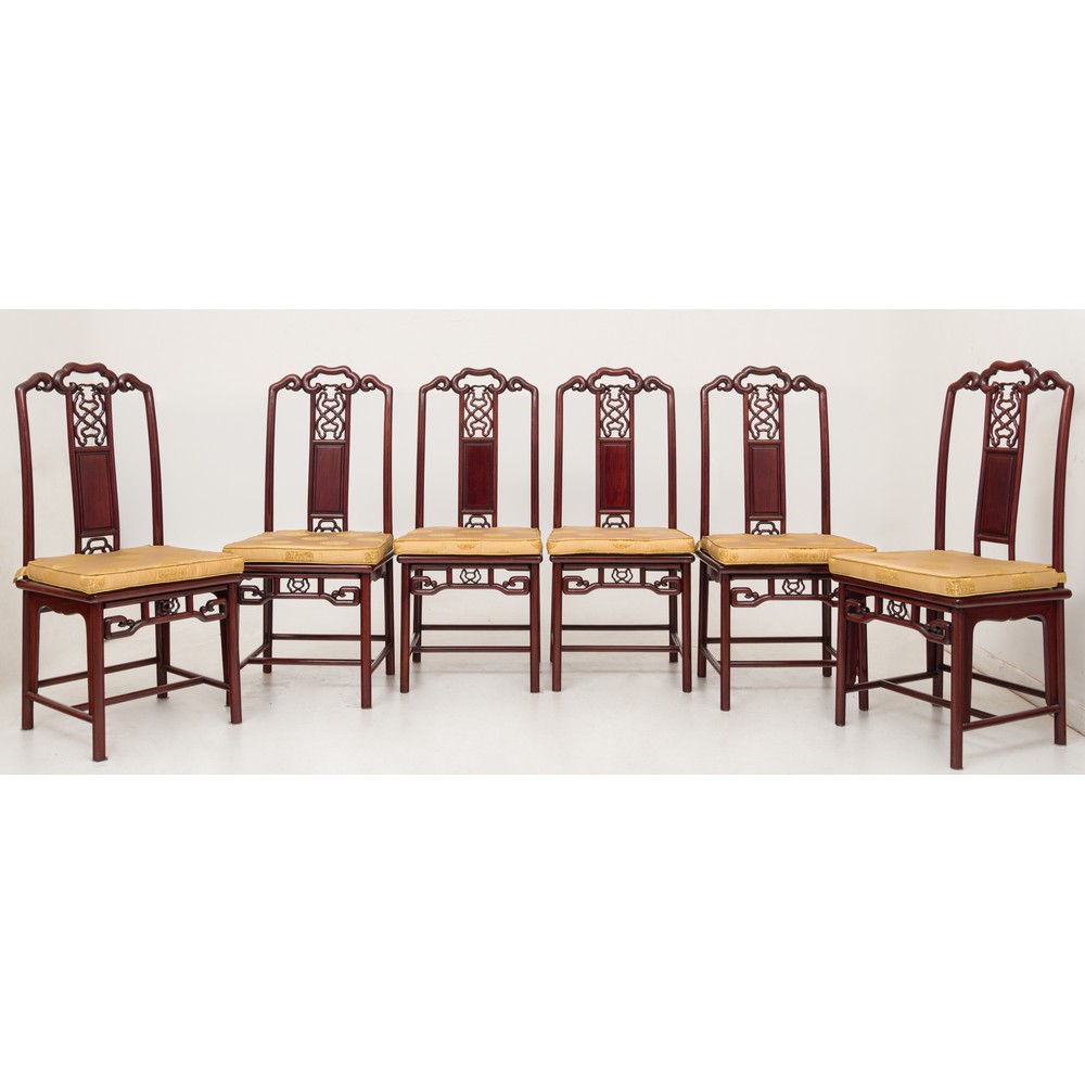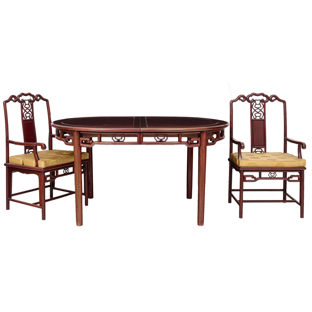TAVOLO, DUE POLTRONE E SEI SEDIE in legno di mogano (due allunghi). Cina XX secolo.