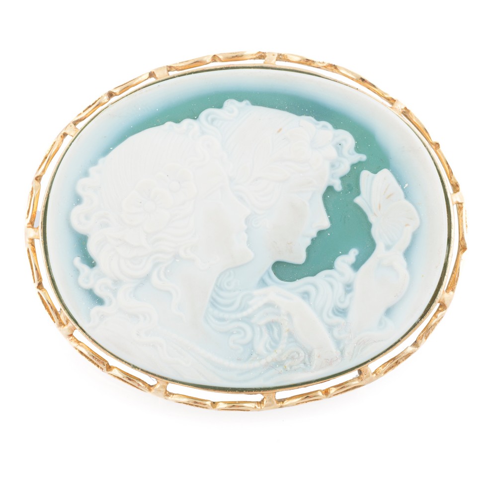 SPILLA in oro giallo 18 KT con cammeo in agata verde raffigurante profili femminili (g. 23,10).