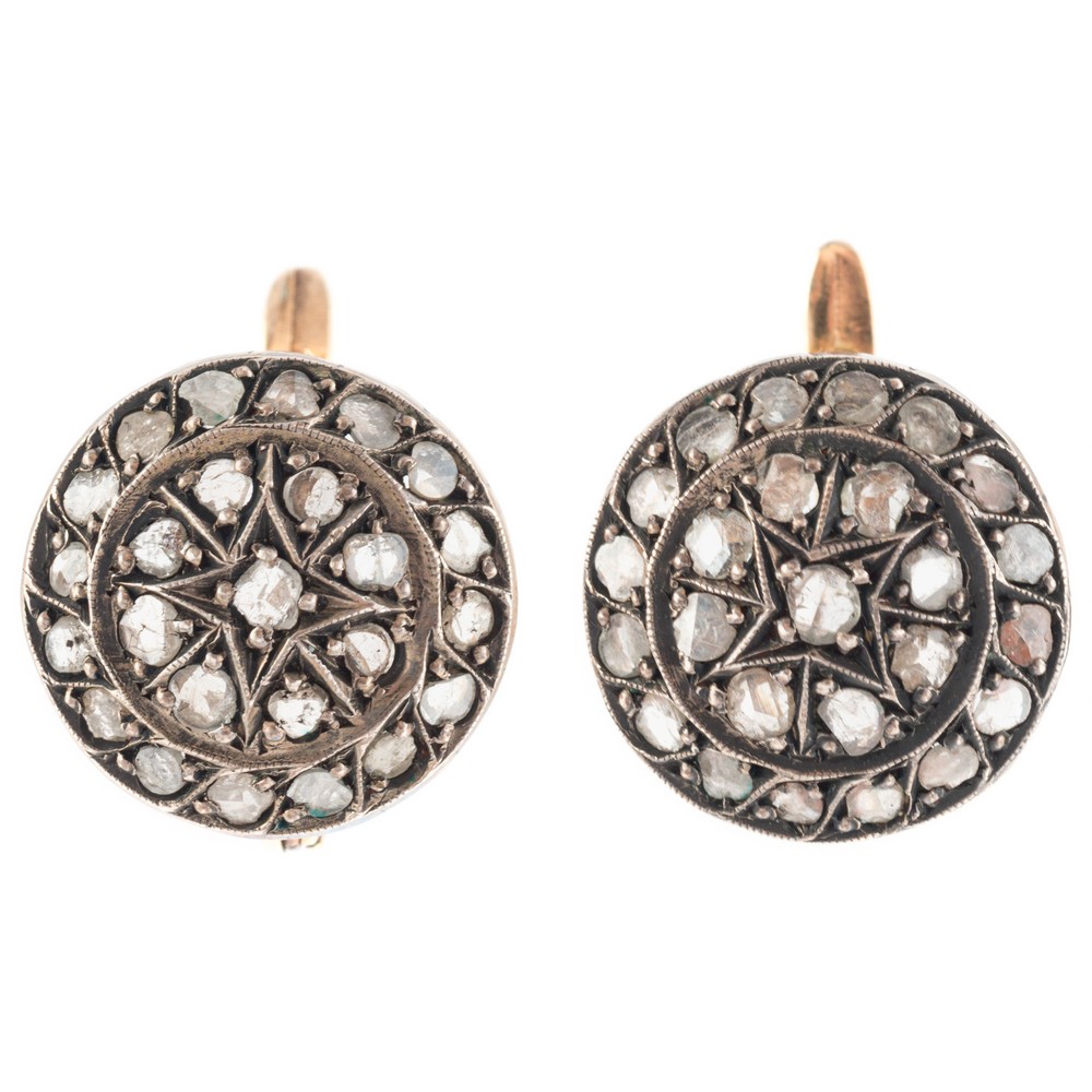 ORECCHINI stile antico in oro 12 KT e argento con diamantini a tre facce (g. 7,70).