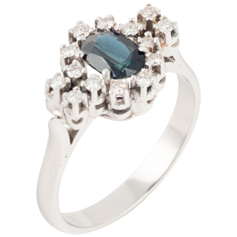 ANELLO in oro bianco 18 KT con diamanti taglio brillante ct. 0,22 e zaffiro centrale ct. 0,70 (g. 5,10).