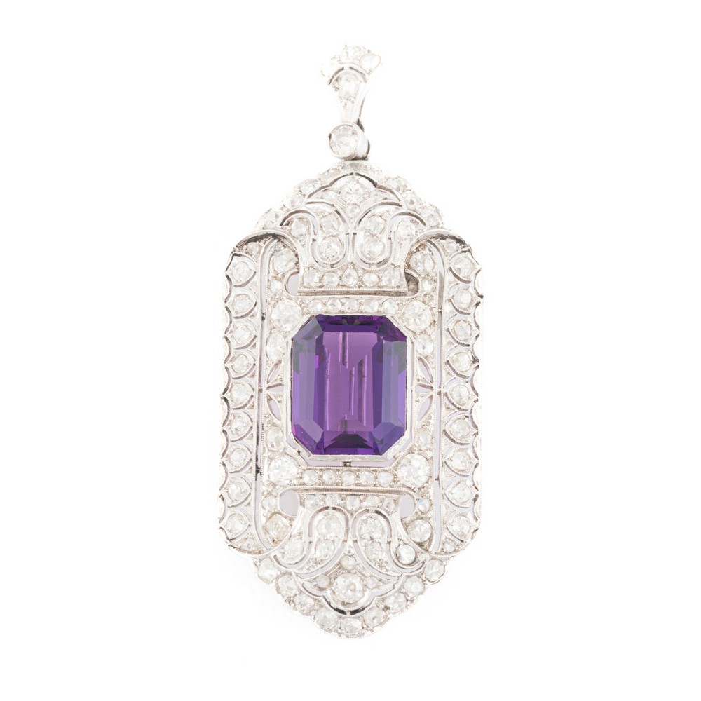 SPILLA/PENDENTE in oro bianco 18 KT con diamanti taglio vecchio ct. 3,00 peso di stima e ametista (g. 14,60).
