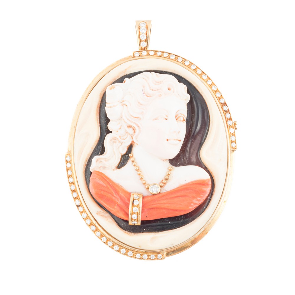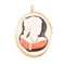 SPILLA/PENDENTE raffigurante "Mezzobusto di gentildonna" in avorio e corallo, diamanti taglio brillante ct. 0,95 peso di stima I color VS1 e cornice in oro giallo 18 KT (g. 35,60).