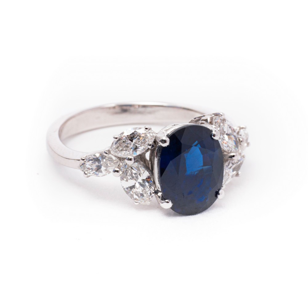 ANELLO in oro bianco con diamanti taglio marquise e zaffiro