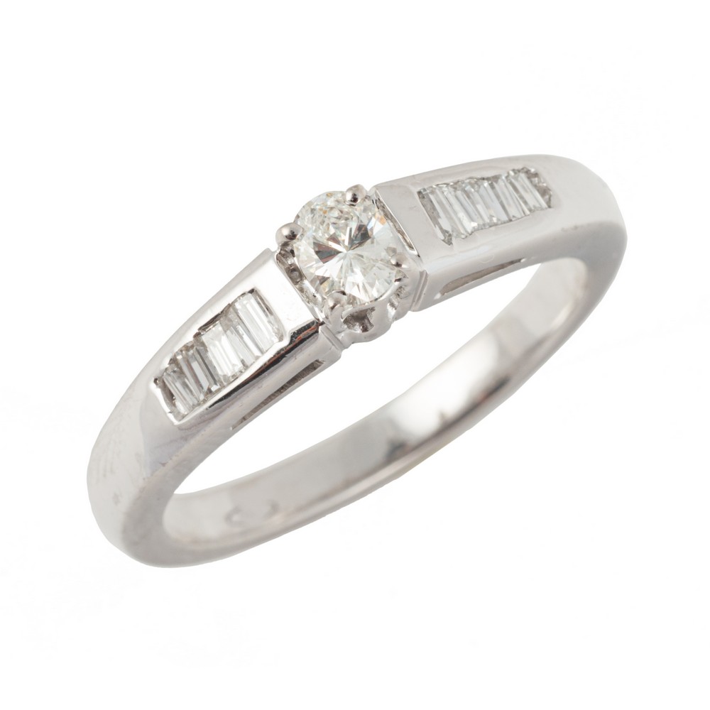 ANELLO in oro bianco 18 KT con diamante ovale ct. 0,23 peso di stima H color VS1 e diamanti taglio baguette ct. 0,30 peso di stima H color VS1 (g. 4,70).