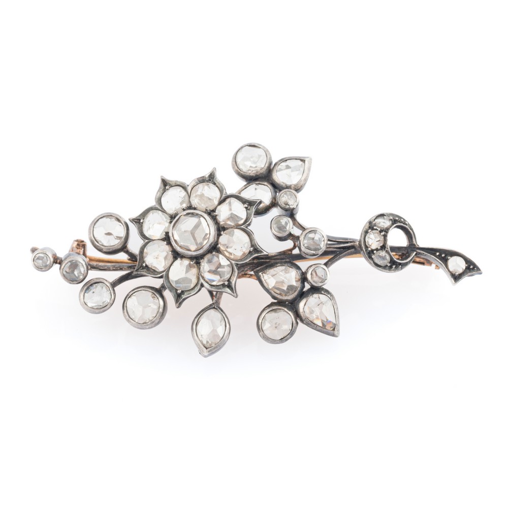 SPILLA in oro basso titolo, argento e rose coronè ct. 3,00 (peso di stima).