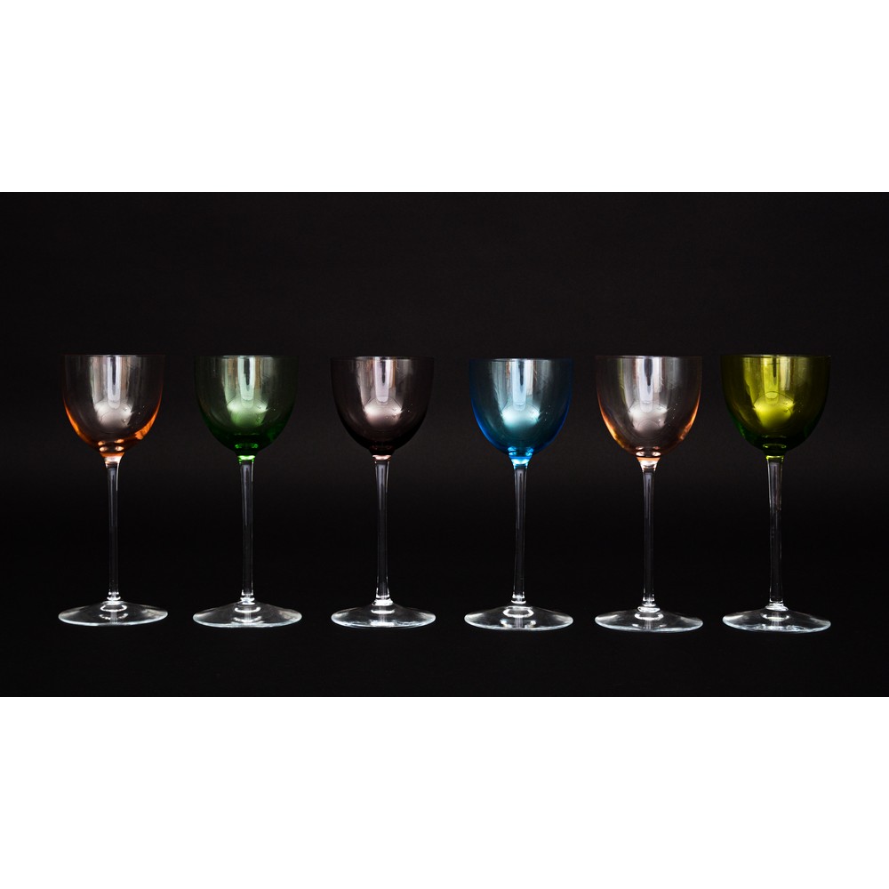 SEI BICCHIERI con gambo lungo in cristallo colorato di diverse tonalità. Francia XX secolo.