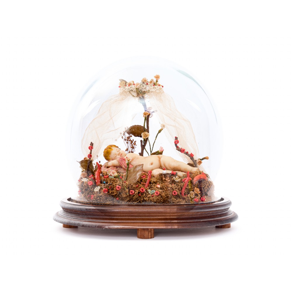 BAMBINELLO in cera con inserti e applicazioni in corallo, entro campana in vetro. Sicilia primi '900.