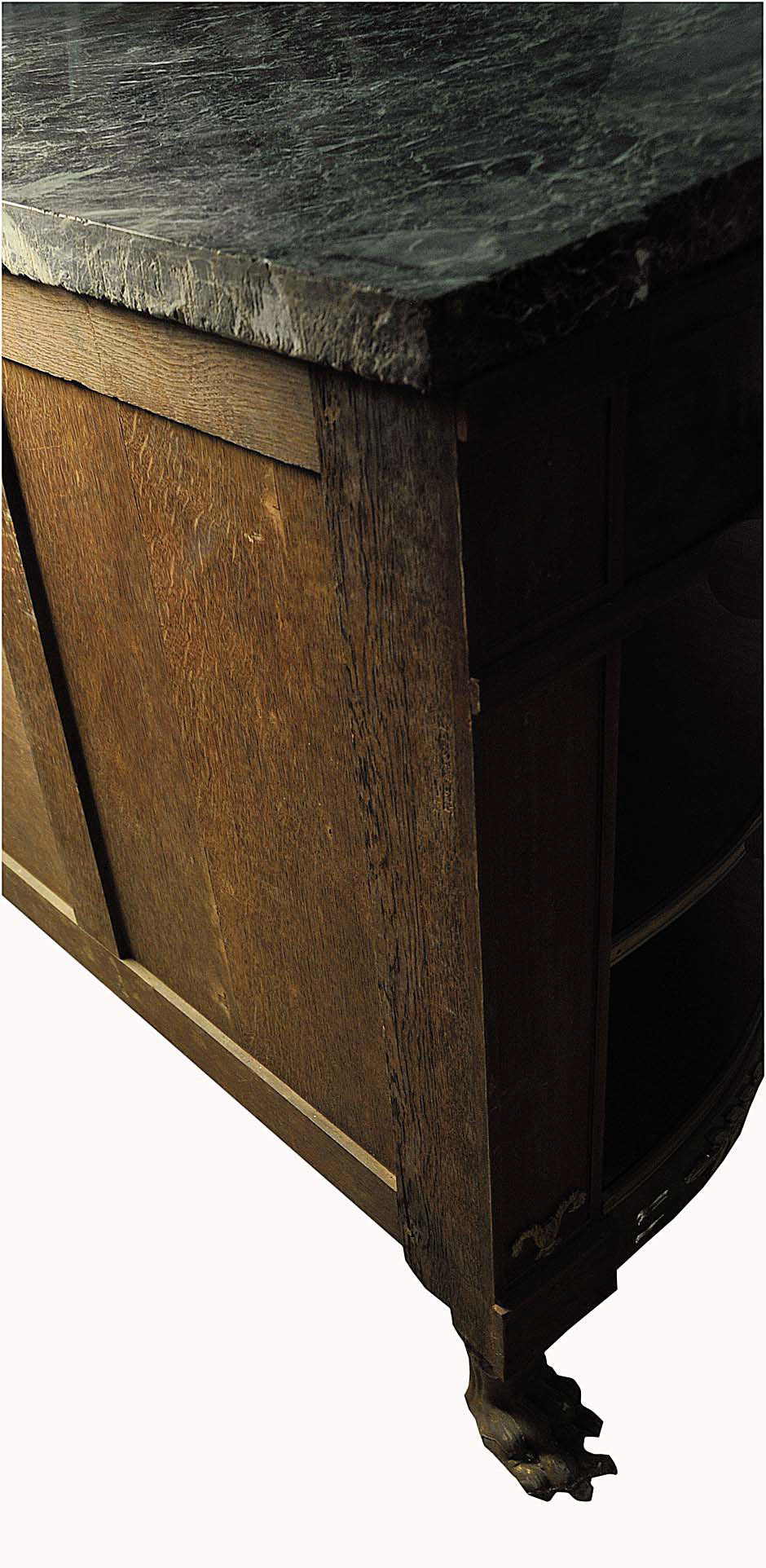 SERVANTE IN STILE II IMPERO Produzione francese, II metà del XIX secolo Impiallicciatura in palissandro (?), marmo nero portoro (?), bronzo dorato 95x192,5x62,4 cm. Stato di conservazione Superficie: 90% Struttura: 90% Note: Chiavi mancanti, serrature chiuse