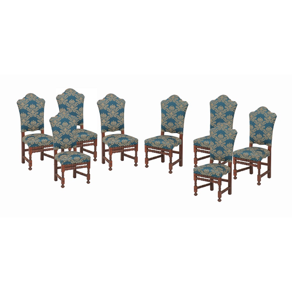 OTTO SEDIE di gusto rinascimentale in legno di noce, tappezzeria damascata nei toni del celeste. Italia XX secolo.