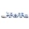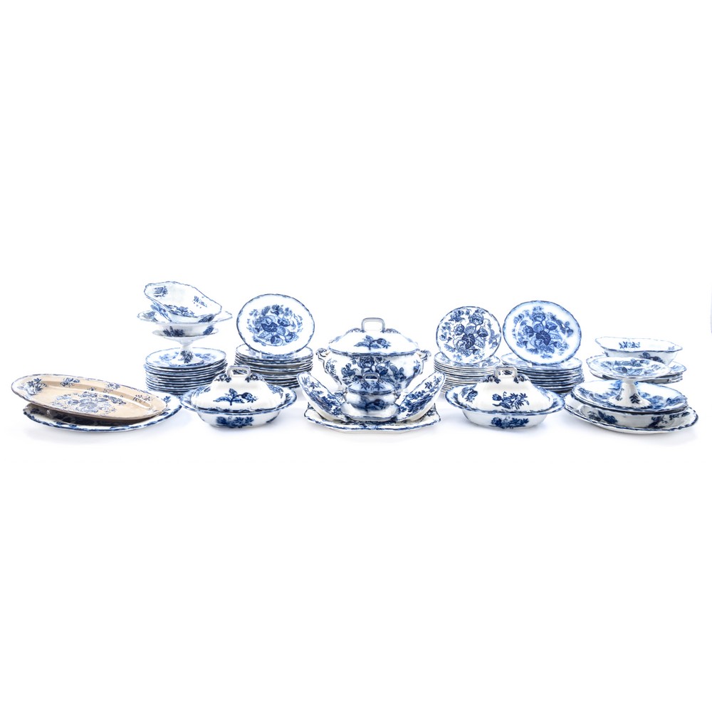 SERVIZIO DI PIATTI in porcellana Water Nymph decorato a motivo fogliaceo nei toni del blu, composta da 3 zuppiere, 1 salsiera, 2 insalatiere, 2 raviere, 2 alzatine, 10 piatti da portata, 24 piatti piani, 12 piatti fondi, 18 piatti frutta (usure). Inghilterra seconda metà del XIX secolo.