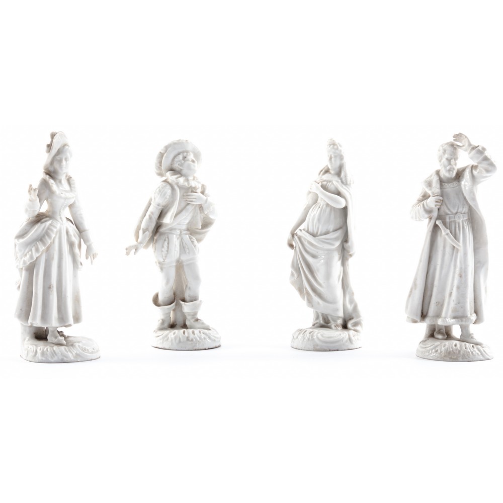 QUATTRO SCULTURE in porcellana Capodimonte nei toni del bianco raffigurante personaggi (usure e difetti). Italia XIX secolo.