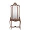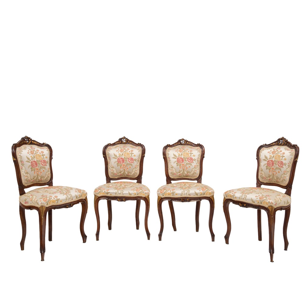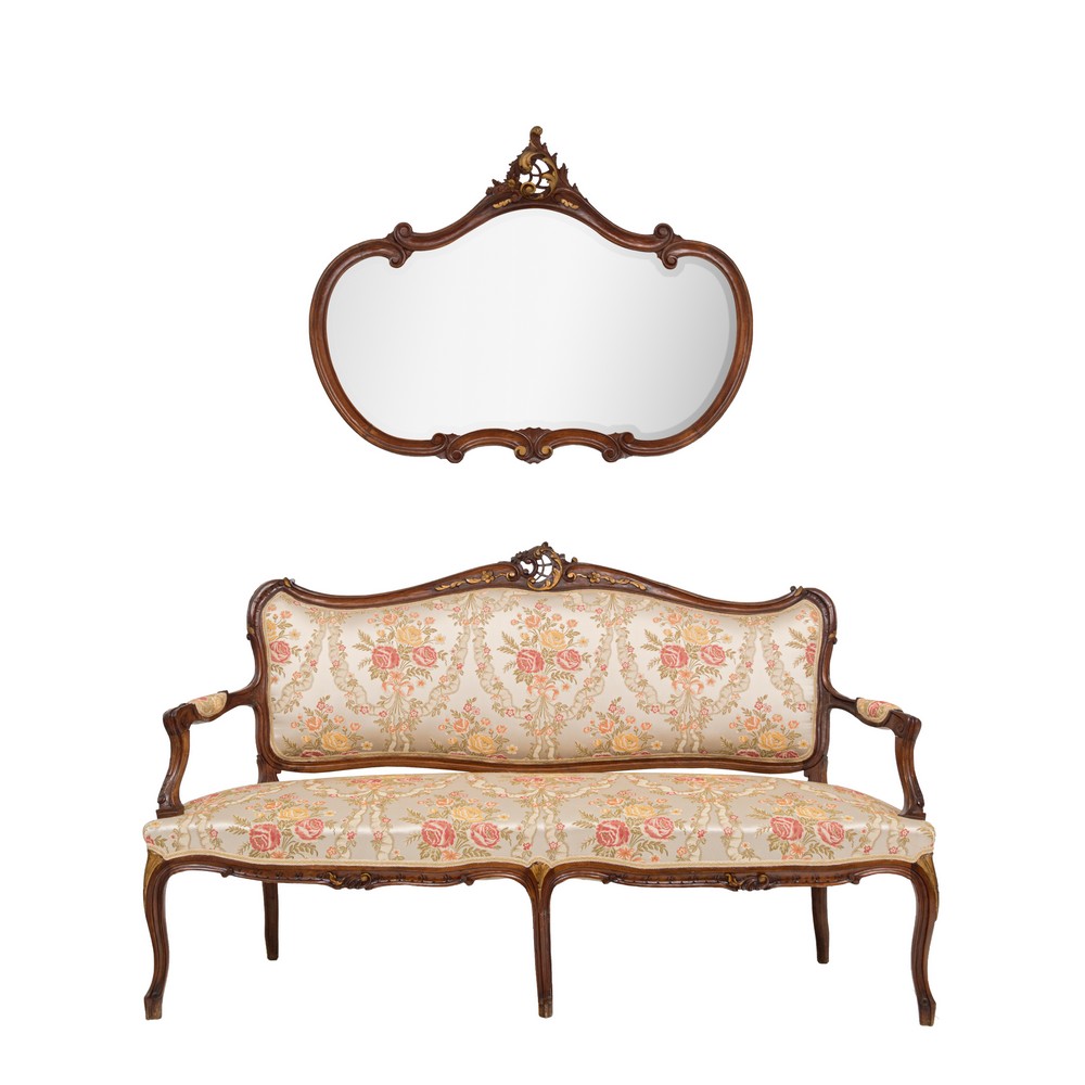 Salotto stile Luigi XV in legno di noce composto da divano, due poltrone tappezzate in raso, consolle con specchiera, due pouff, tavolino, quattro sedie e specchio. Sicilia primi '900.