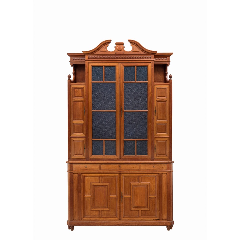 CREDENZA CON ALZATA in legno di ciliegio con due ante sottostanti, tre cassettini e quattro ante nella parte superiore. Francia XIX secolo.