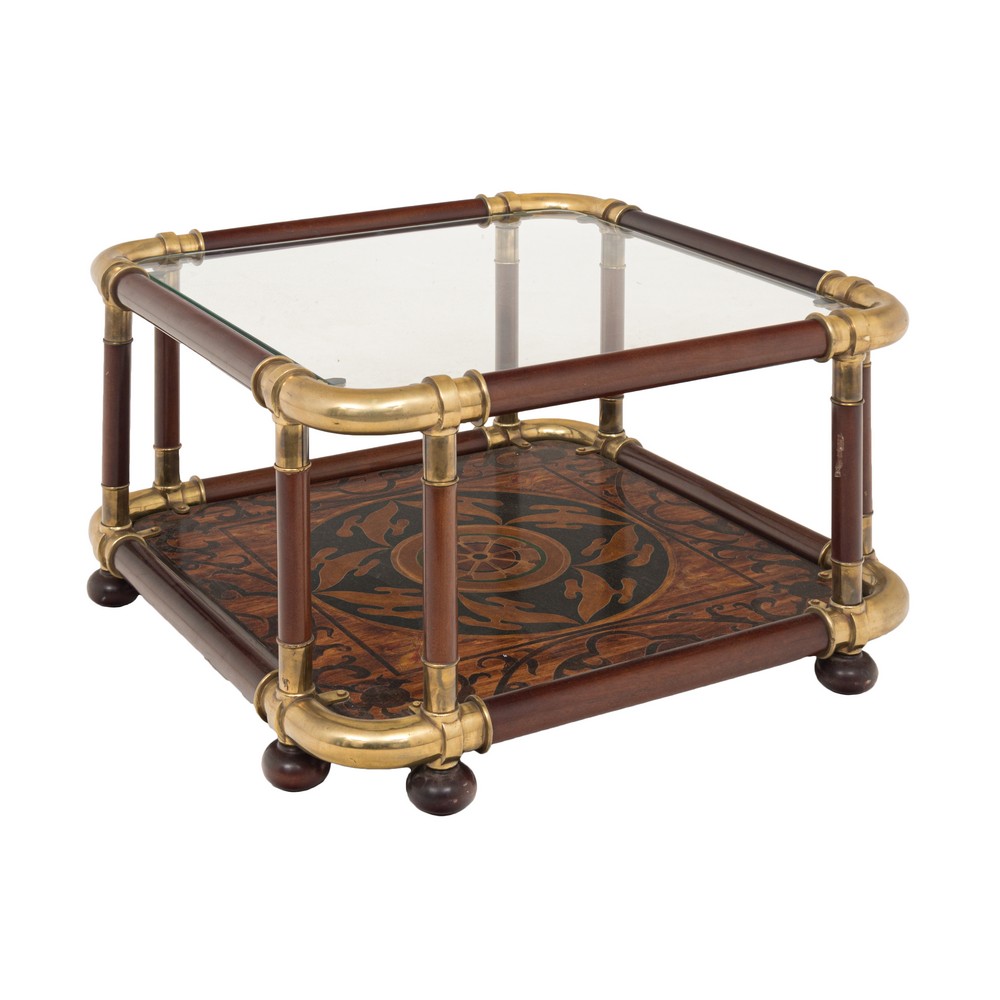 in legno ed ottone di forma quadrata a due ripiani. Piano superiore in vetro, piano inferiore in legno lavorato. XX secolo.