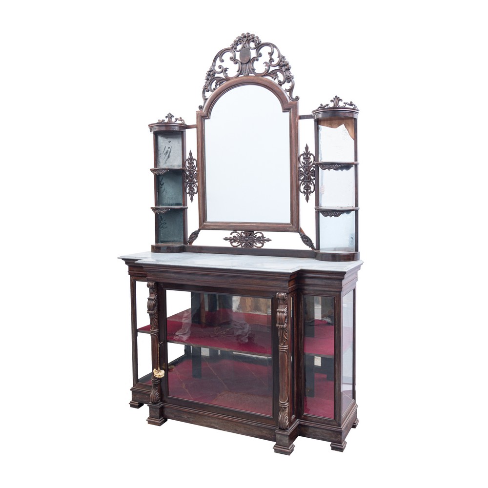 VETRINA espositore con alzata Luigi Filippo in palissandro con un'anta centrale e piano in marmo grigio. Sicilia XIX secolo.