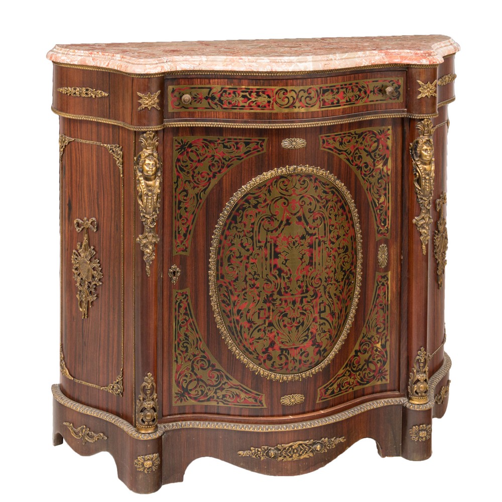 PICCOLA CREDENZA stile Boulle in legno di palissandro con tarsie rame e fregi in bronzo. Francia XX secolo.