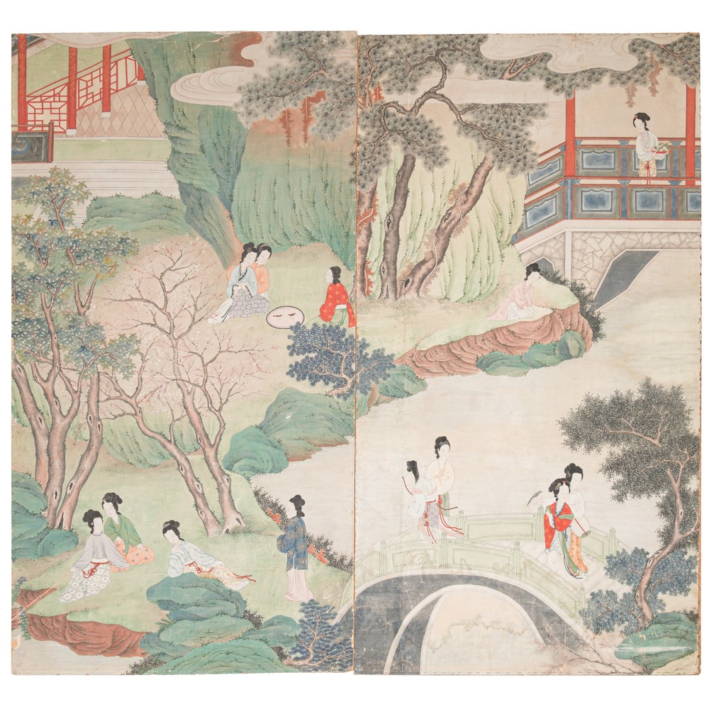 Importante coppia di pannelli raffiguranti scene di vita orientale, pittura su carta di riso telata applicata su tavola.