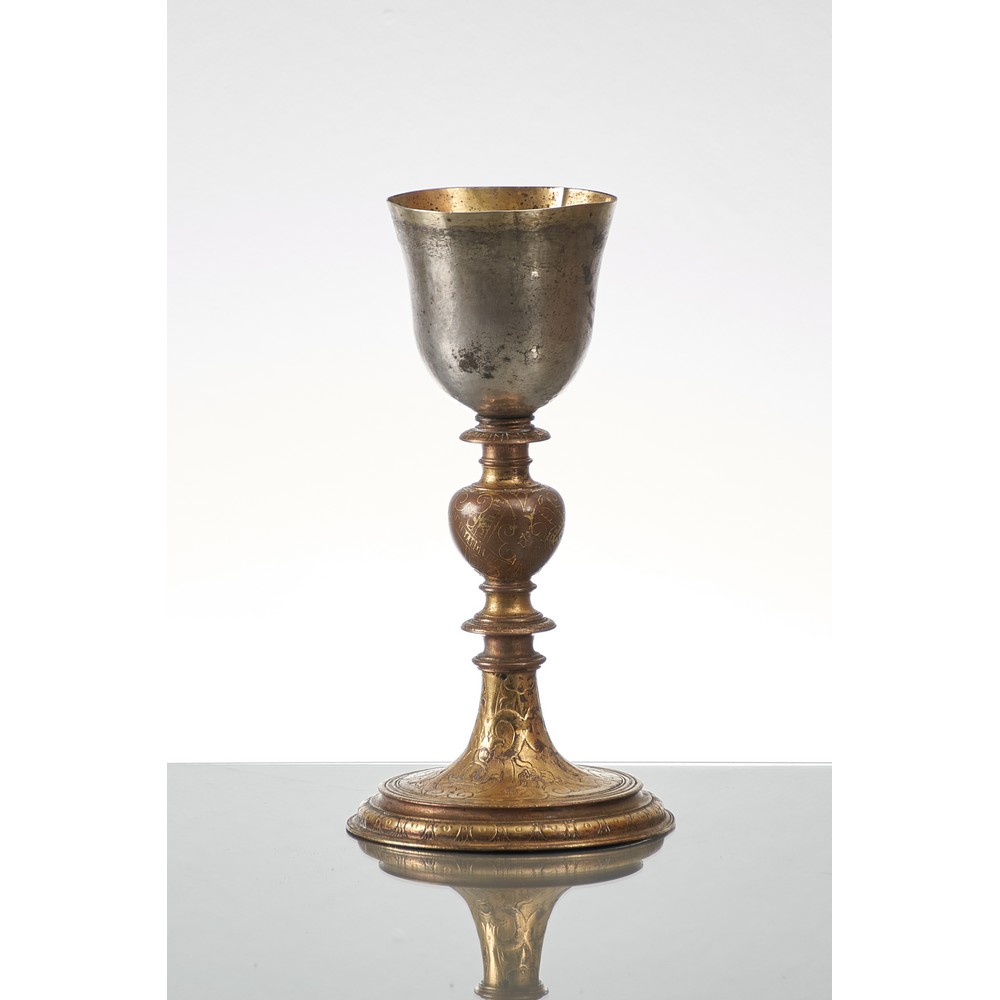 Importante e raro calice in argento e rame inciso e lavorato raffigurante La Passione di Cristo.