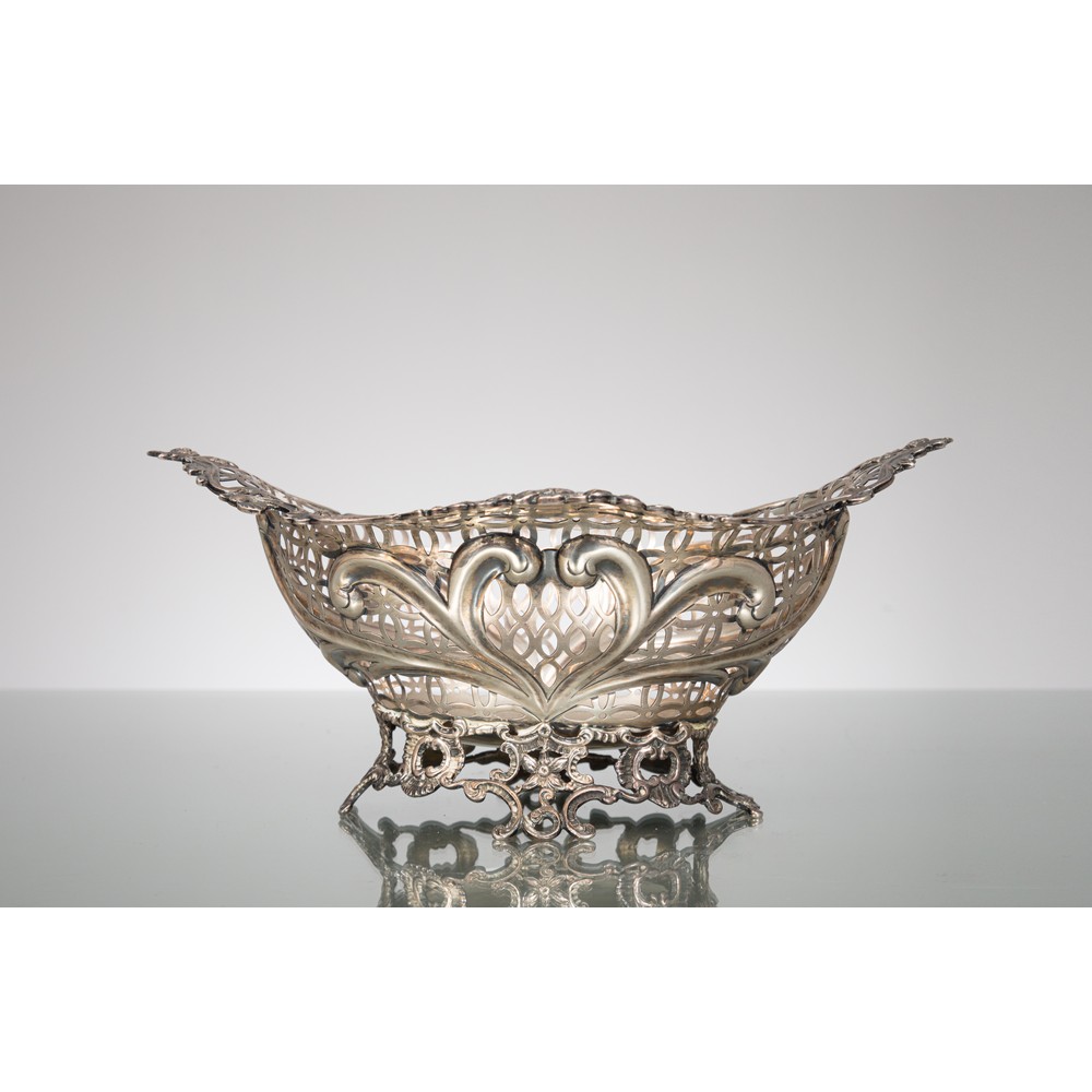 Centrotavola in argento finemente cesellato e traforato con decori a motivi floreali.