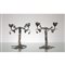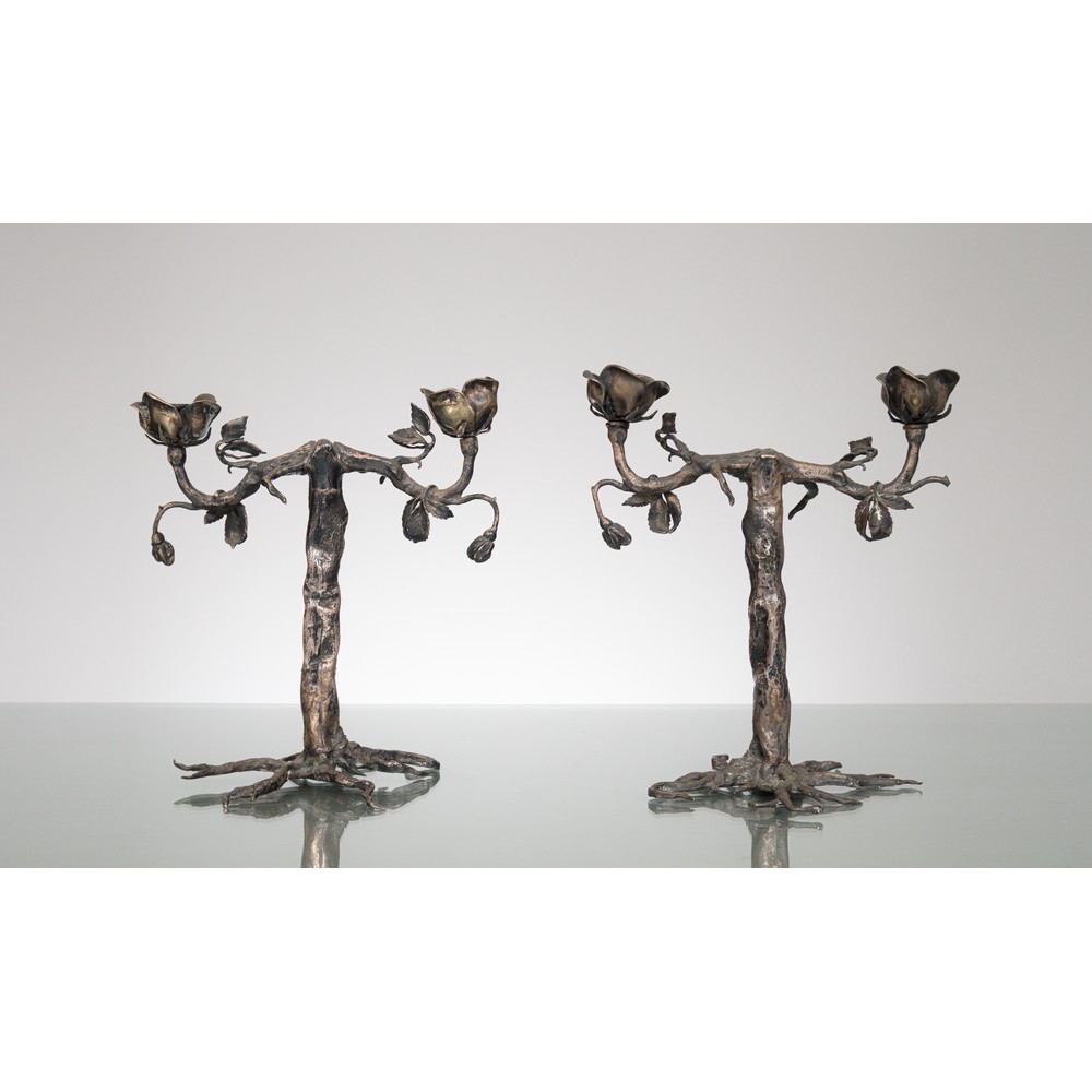 Coppia di portacandela a due fiamme in argento inciso e sbalzato con fusto arboreo e tralci di rose (g. 1142).