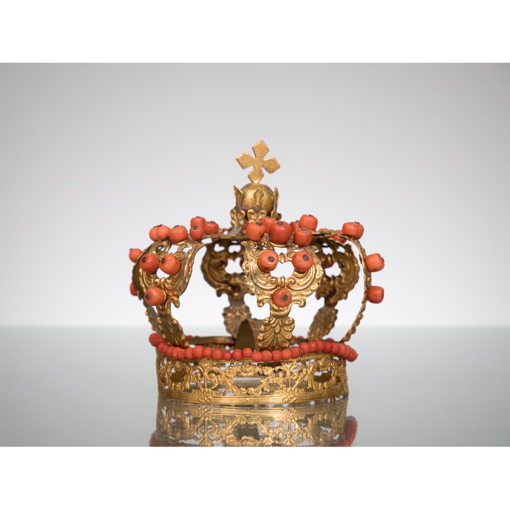 Corona in metallo dorato con inserti gemmati in corallo di Sciacca.