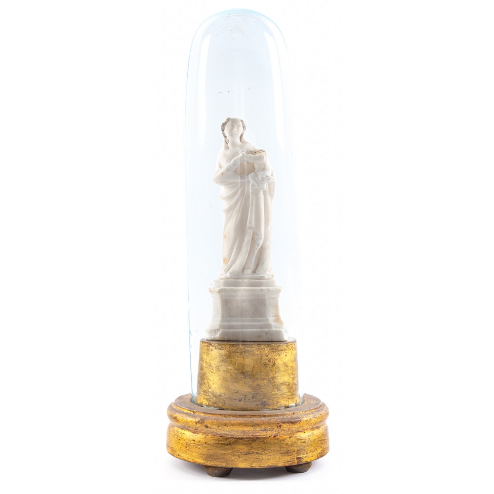 Scultura in alabastro entro campana in vetro su base in legno dorato (difetti).