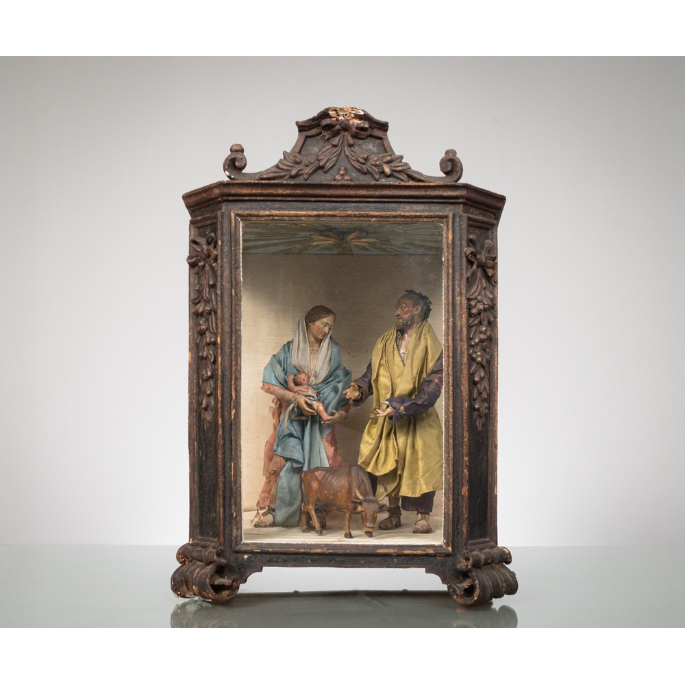 Presepe in terracotta e cartapesta policroma composto da Madonna con Bambino, San Giuseppe e bue entro teca Luigi XIII in legno intagliato (rotture).