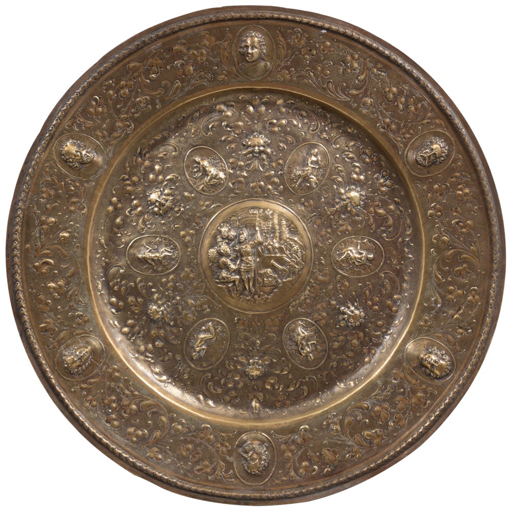 Piatto da parata in rame finemente cesellato e sbalzato a motivi vegetali e grottesche con mezzi busti di condottieri in armi.