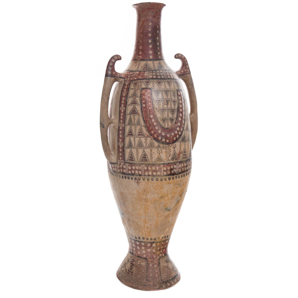 Grande e raro vaso a due anse a coccodrillo in terracotta policroma a decori geometrici (restauri).