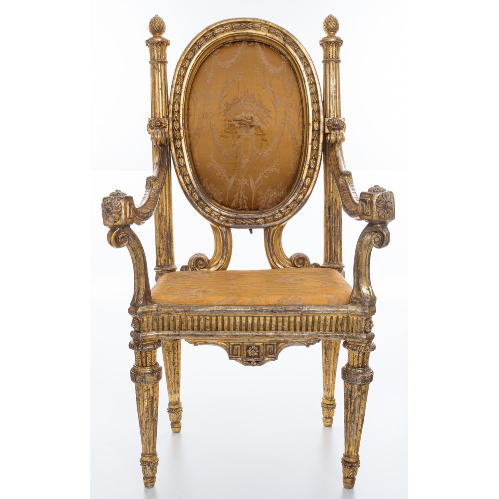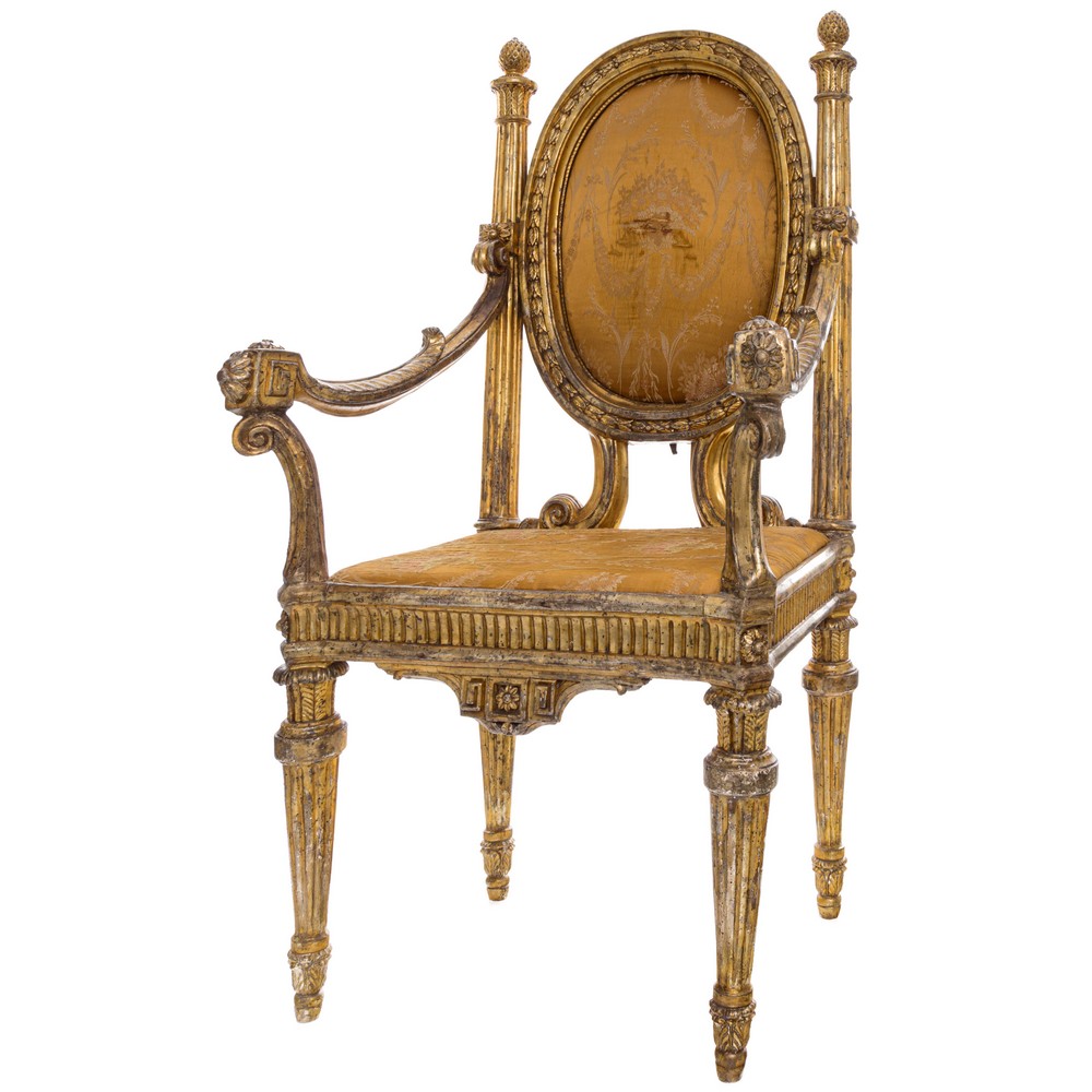 Imponente trono da palazzo Luigi XVI in legno finemente scolpito e dorato ad argento e mistura con tappezzeria nei toni dell'ocra.