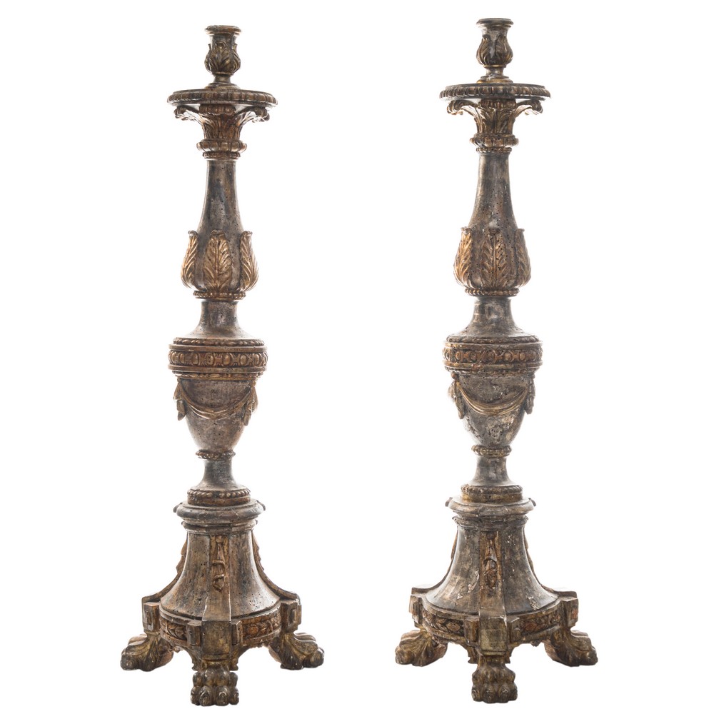Importante coppia di torcieri finemente intagliati e scolpiti, con piedi leonini, dorati ad argento e mistura.