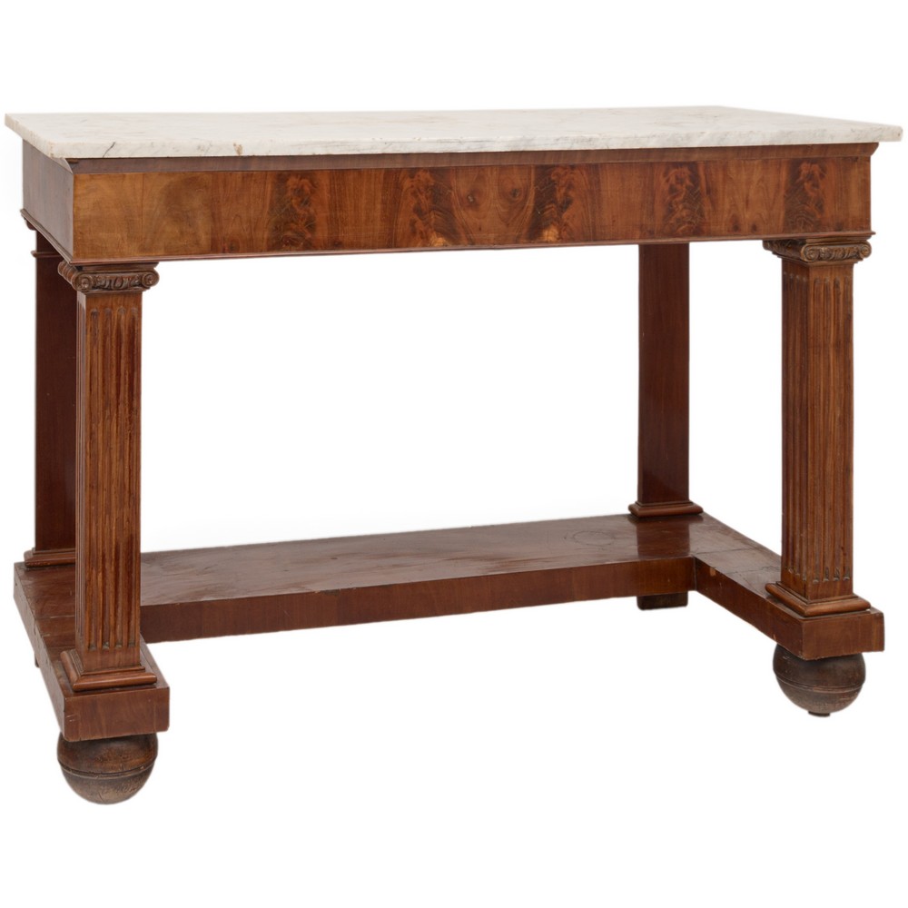 Consolle Impero in legno di mogano lastronato in piuma di mogano, piano in marmo bianco di carrara.