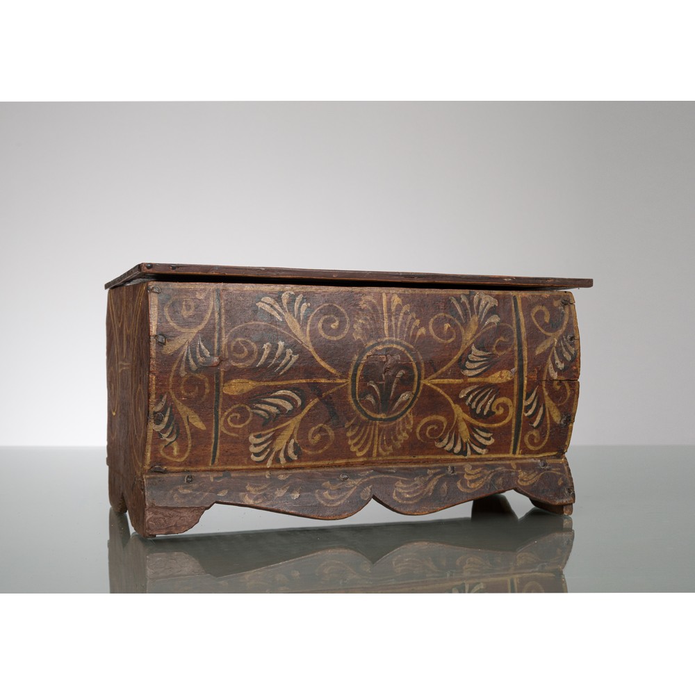 Modellino di cassapanca in legno dipinto e decorato a motivi arborei.
