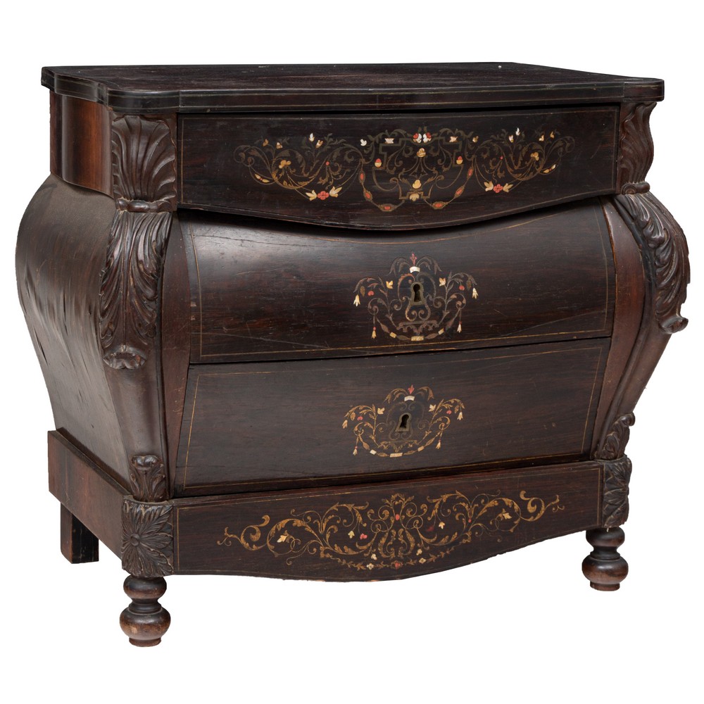Raro cassettone Isabellino a tre cassetti più uno segreto, in legno di palissandro con tarsie in rame e madreperla.