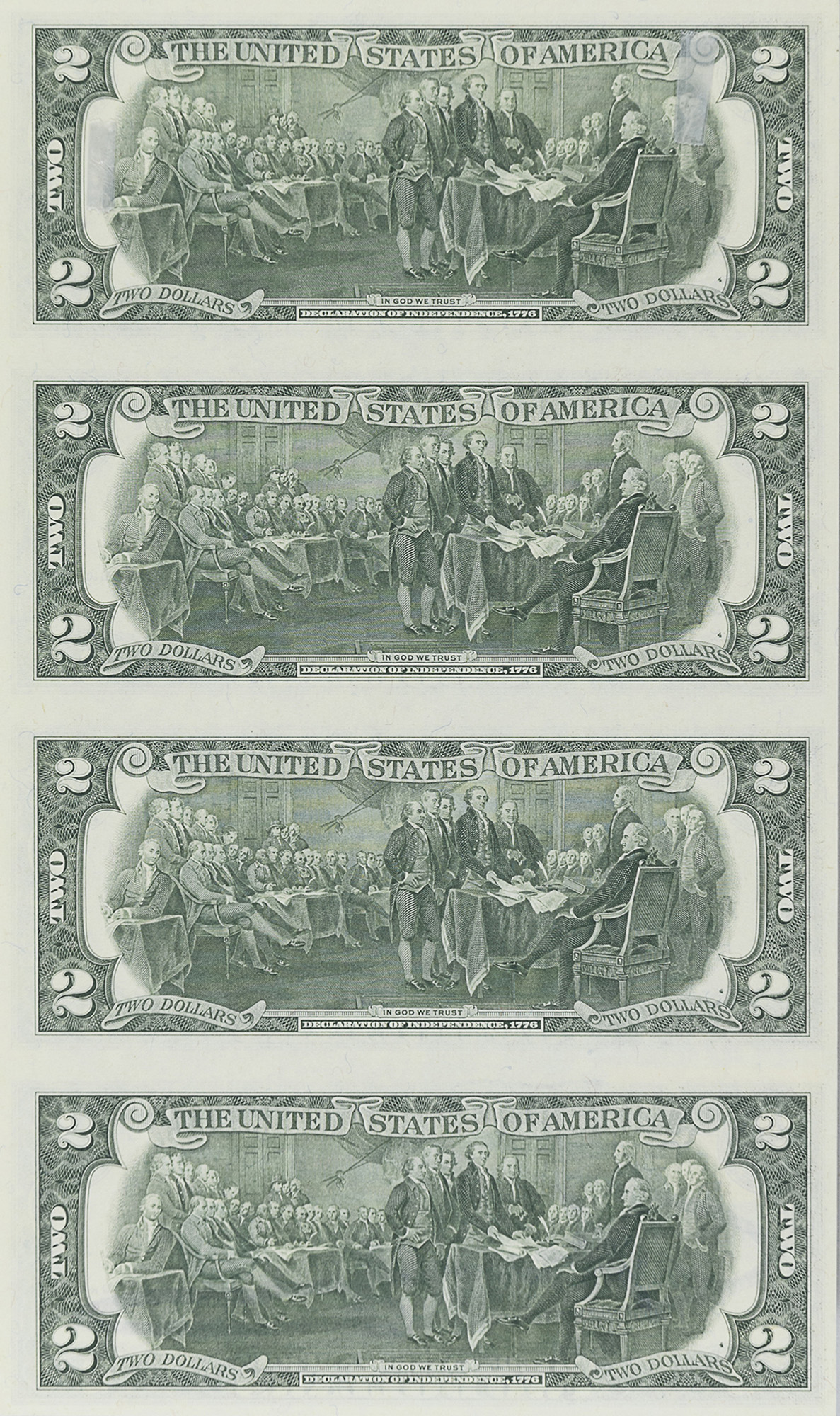 Quattro banconote da due dollari in fior di conio, cm. 26,5 x 15,5