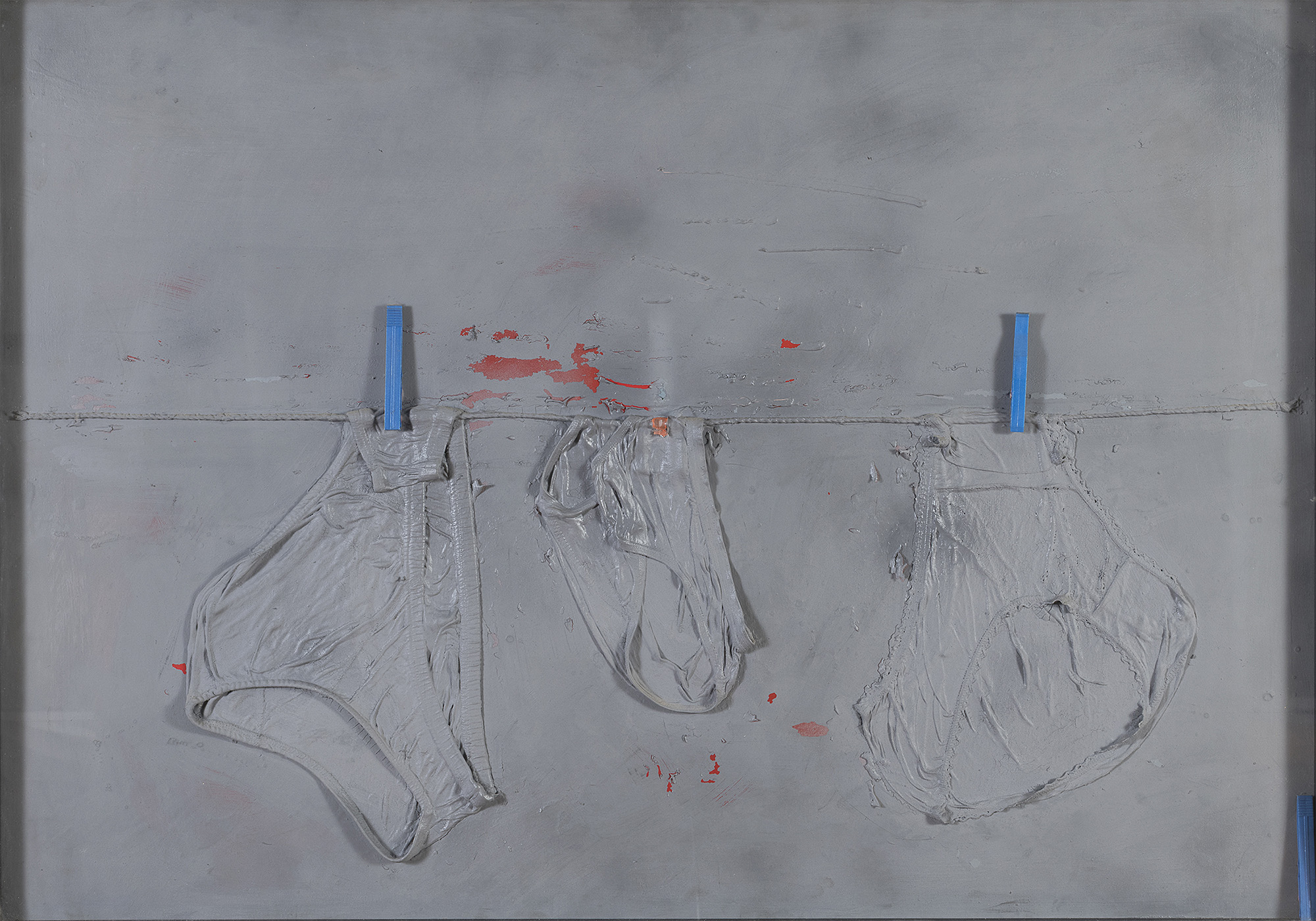 Tecnica mista con mutande corda, mollette, e acrilico su tela, cm. 70 x 100