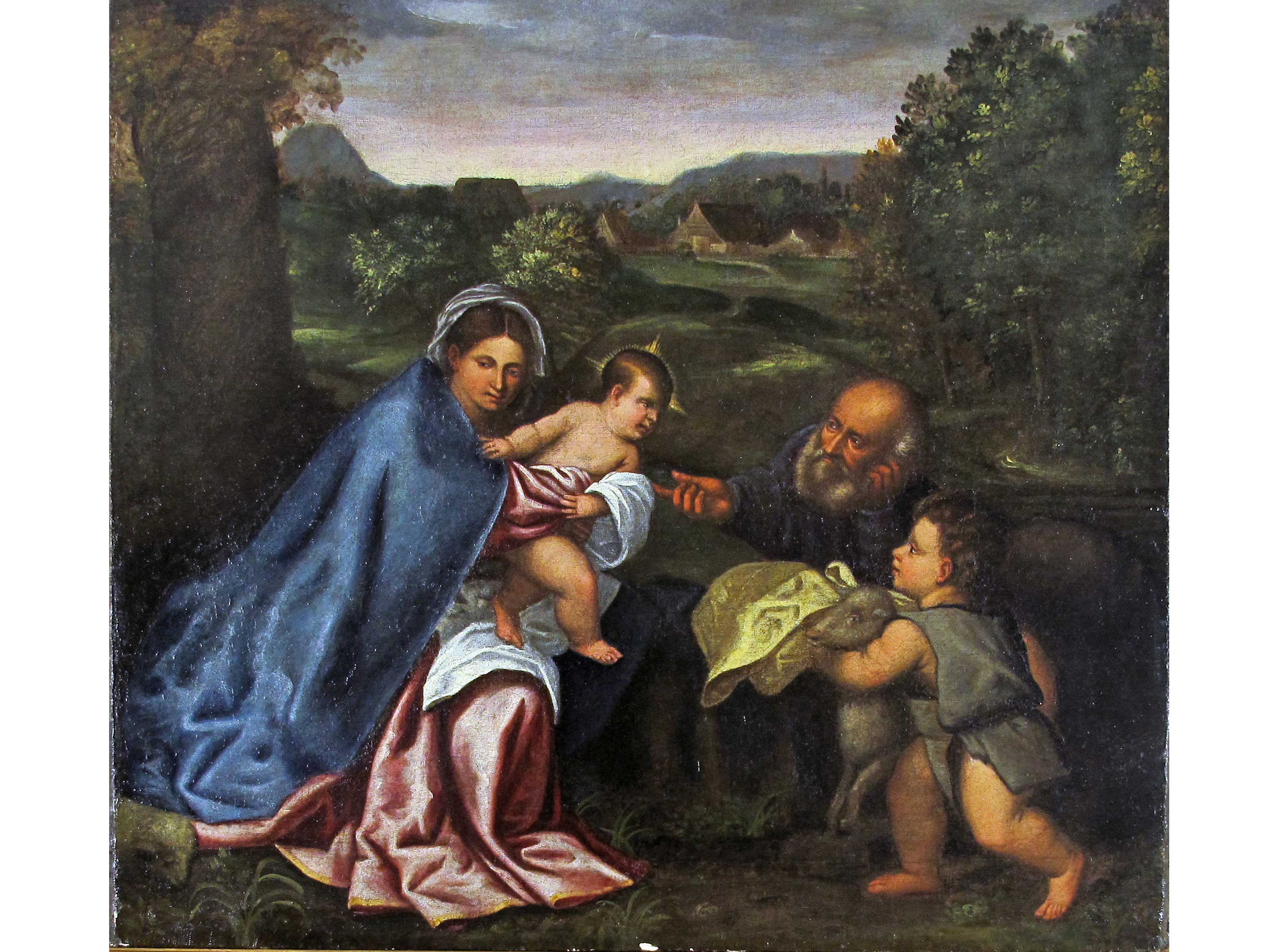 Scuola veneta XVII secolo Sacra Famiglia con San Giovannino Olio su tela Senza cornice Misure 74x82 cm