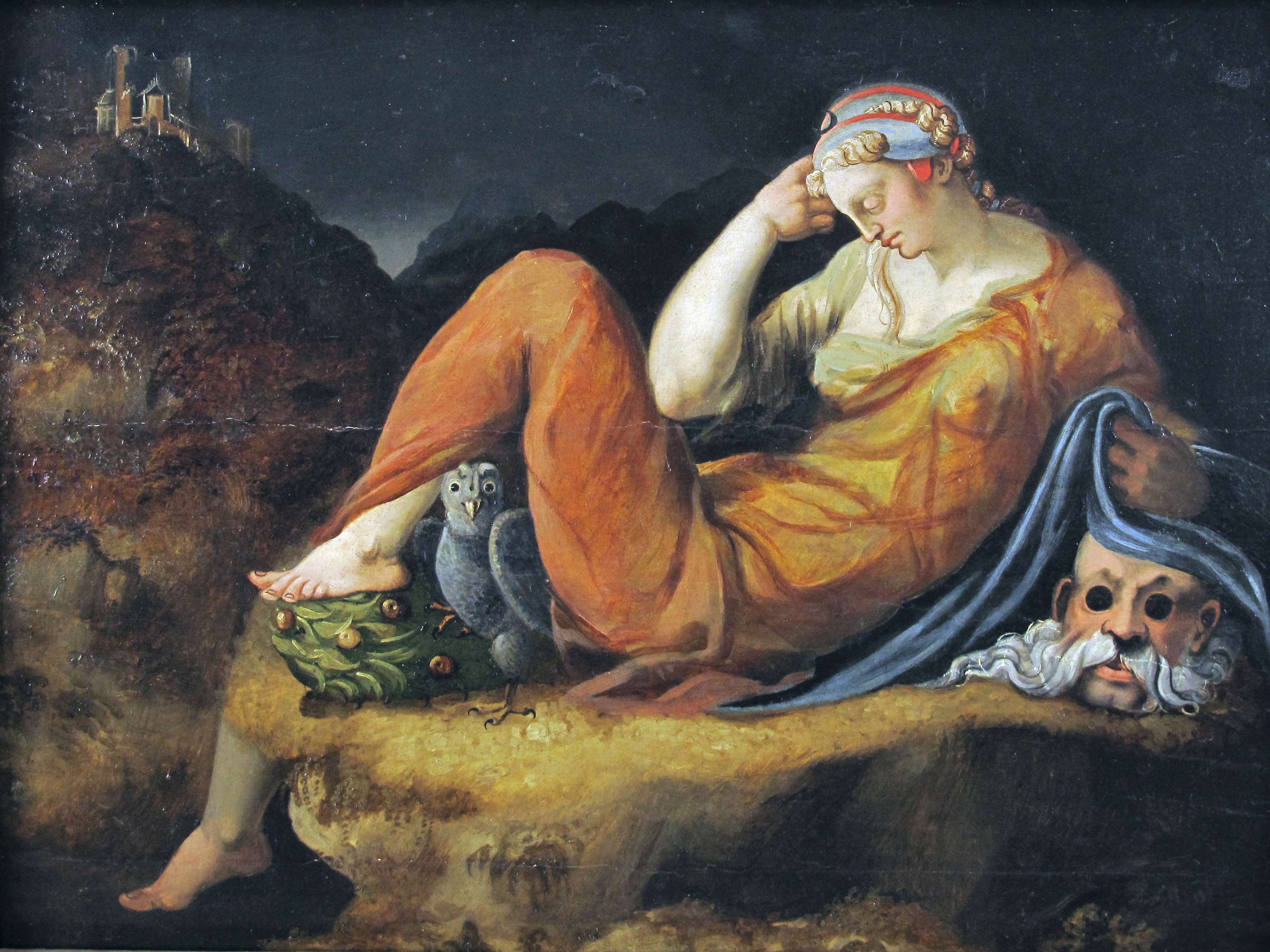 La figura allegorica è tratta dalla scultura facente parte della decorazione della Sagrestia Nuova in San Lorenzo a Firenze. In particolare è una delle quattro allegorie delle Parti della Giornata, e si trova a sinistra sul sarcofago della tomba di Giuliano de' Medici duca di Nemours. Fine XVI secolo La Notte Olio su tavola Misure 57x76 cm