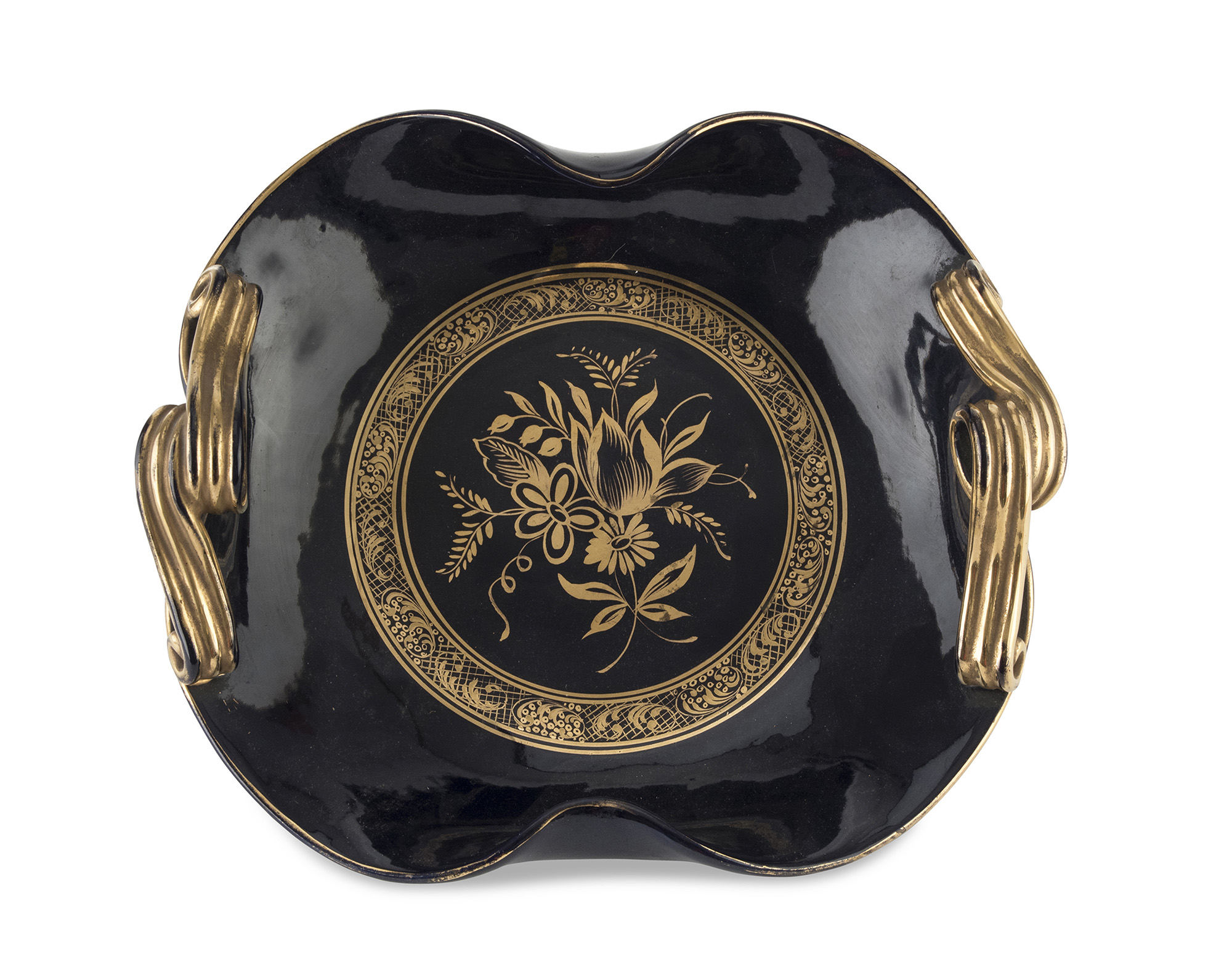 a smalto cobalto e oro, con finiture e decoro a fiori in oro. Corpo a fazzoletto.